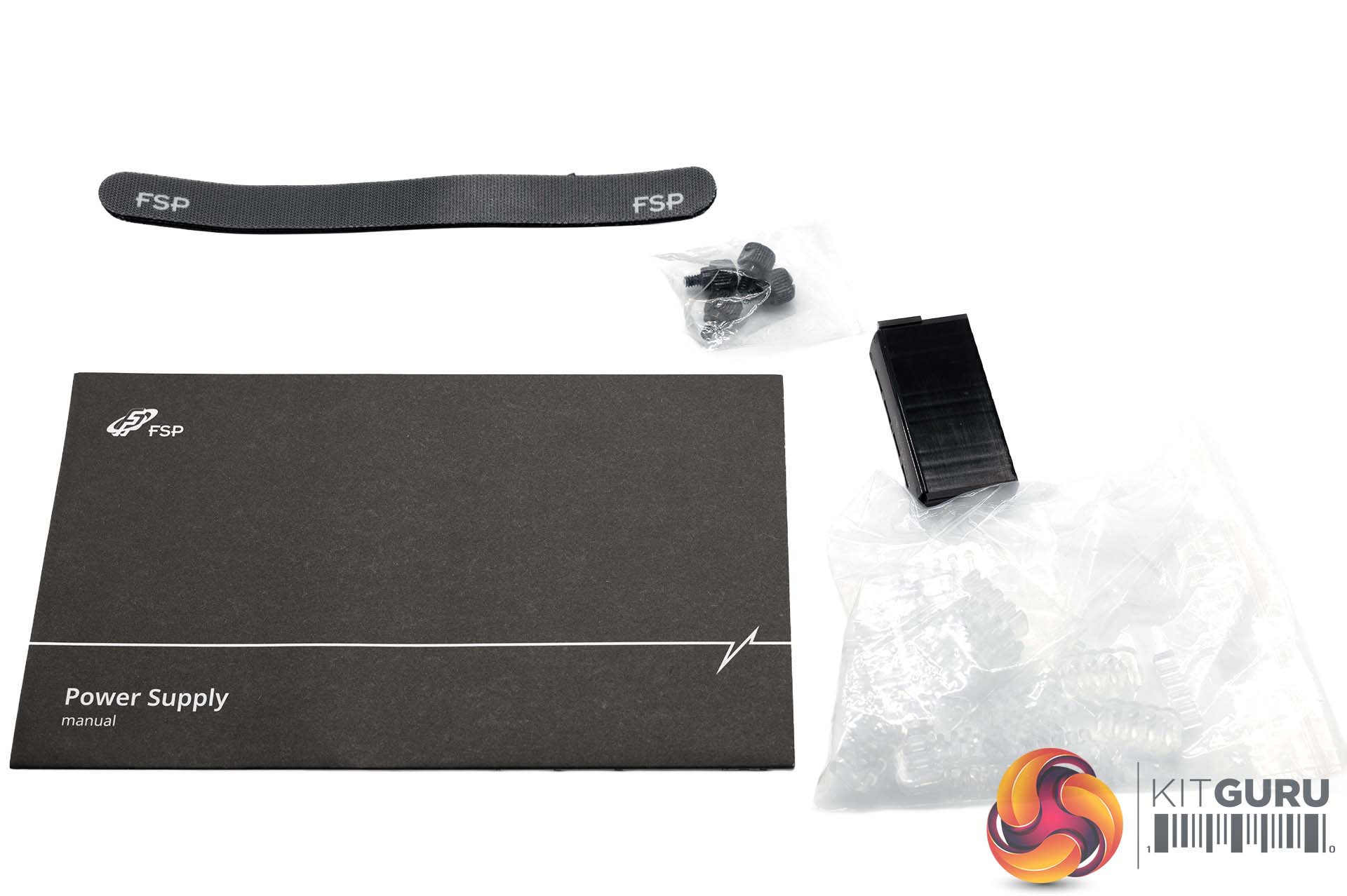 The accessories box contains literature on the power supply, alongside cable combs, a tester, ties, and mounting screws.
