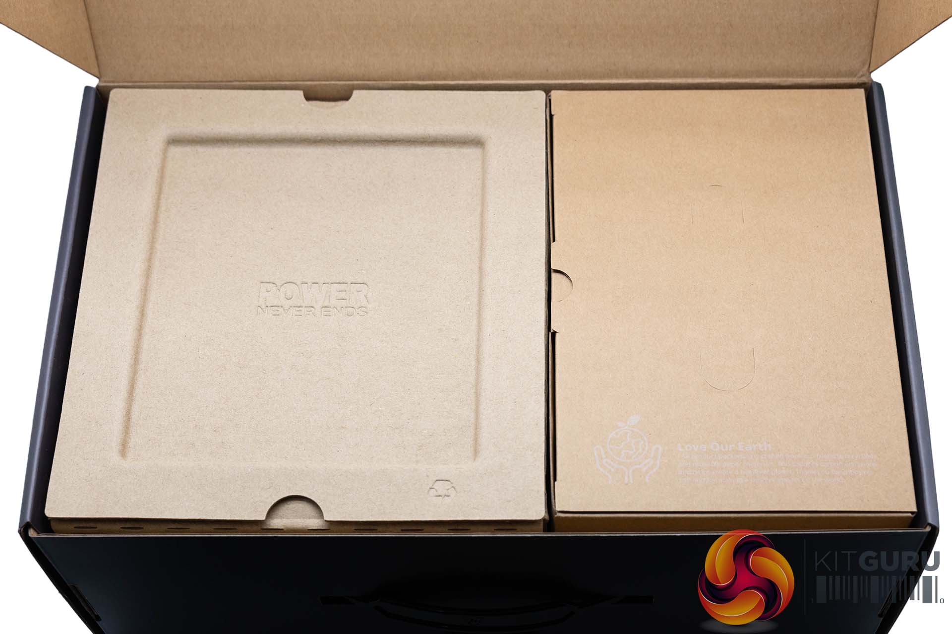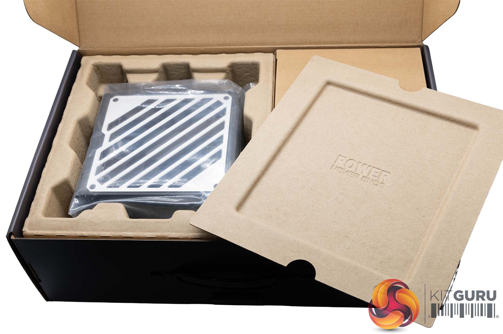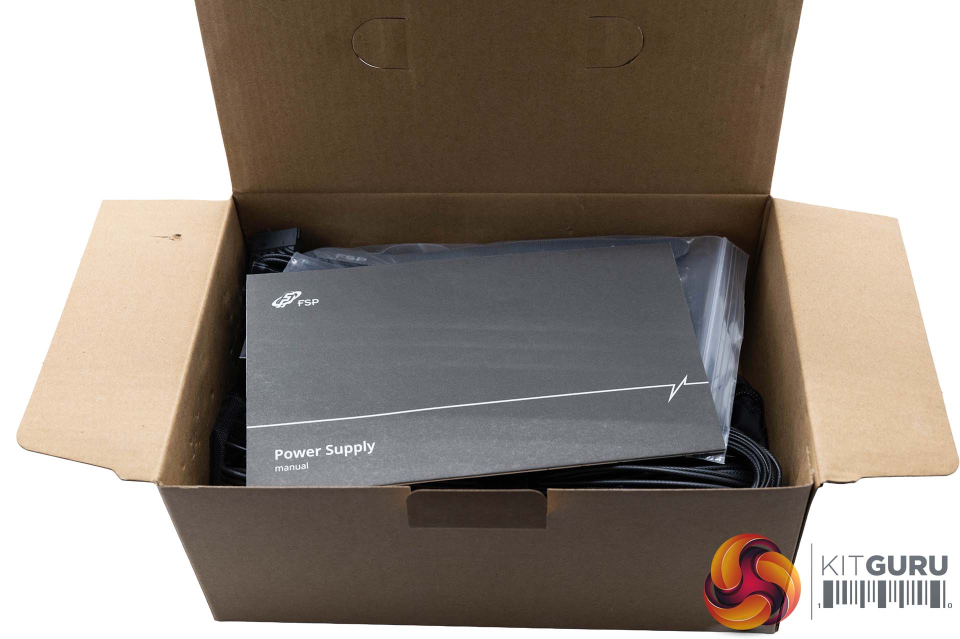 The PSU is very well protected inside a cardboard housing. The accessories are in a separate box on the right.