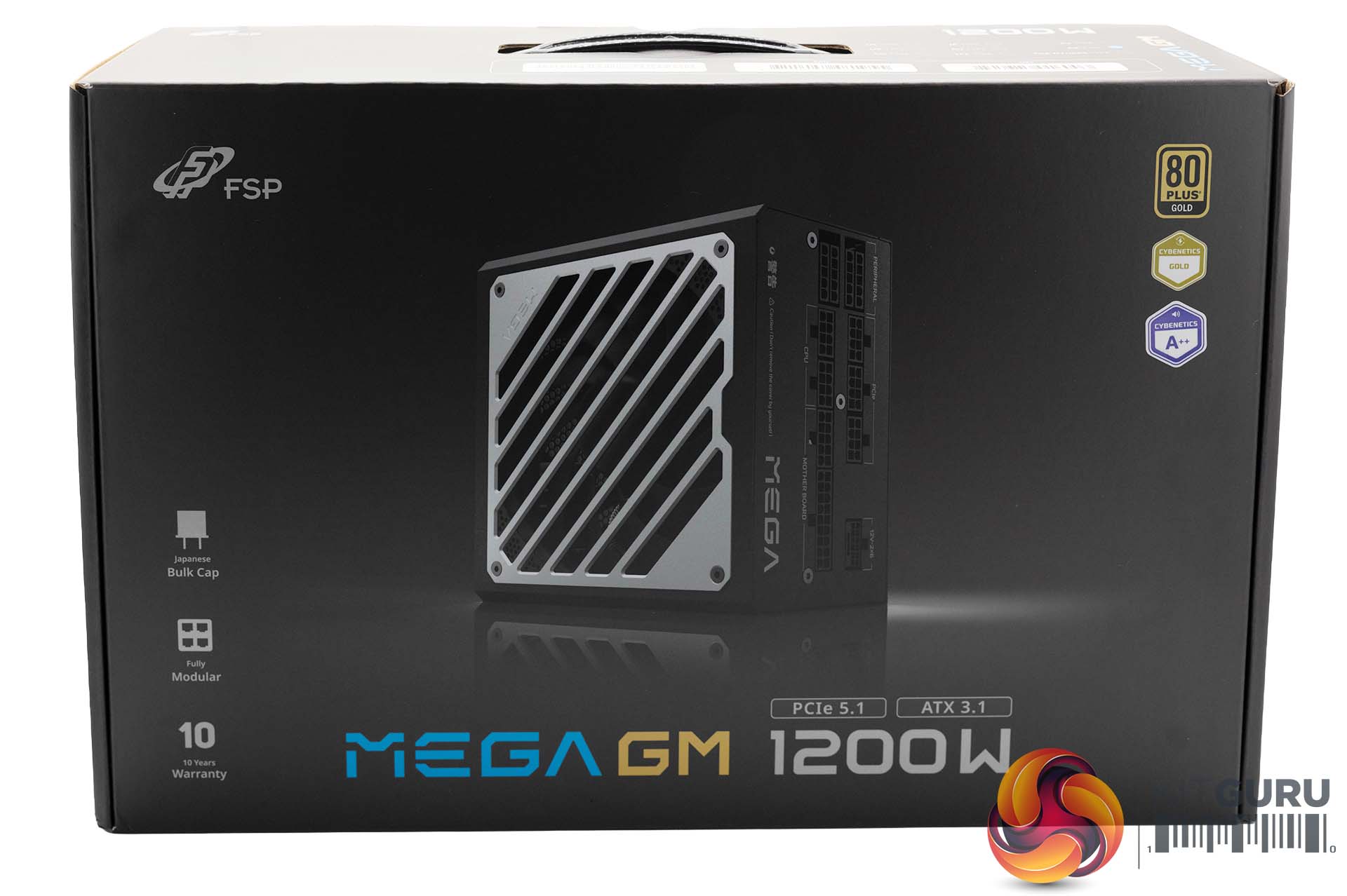The Mega GM 1200W ships in a nicely designed box, with key specifications (PCIe 5.1/ATX 3.1) and certifications on the front, alongside a high-resolution image of the unit in the middle. Always good to see Cybenetics awards getting featured as they mean more in 2026 than 80 Plus.