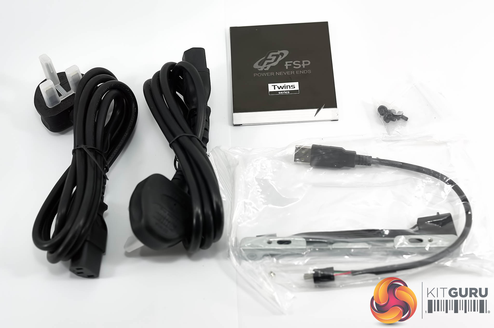 Inside the black box are two standard power connectors for each supply, a user manual and some fittings and cables for the build. The Twins power supply ships with a USB cable which can connect to the motherboard directly for monitoring support. You can download the monitoring and analysis software directly from the FSP website.