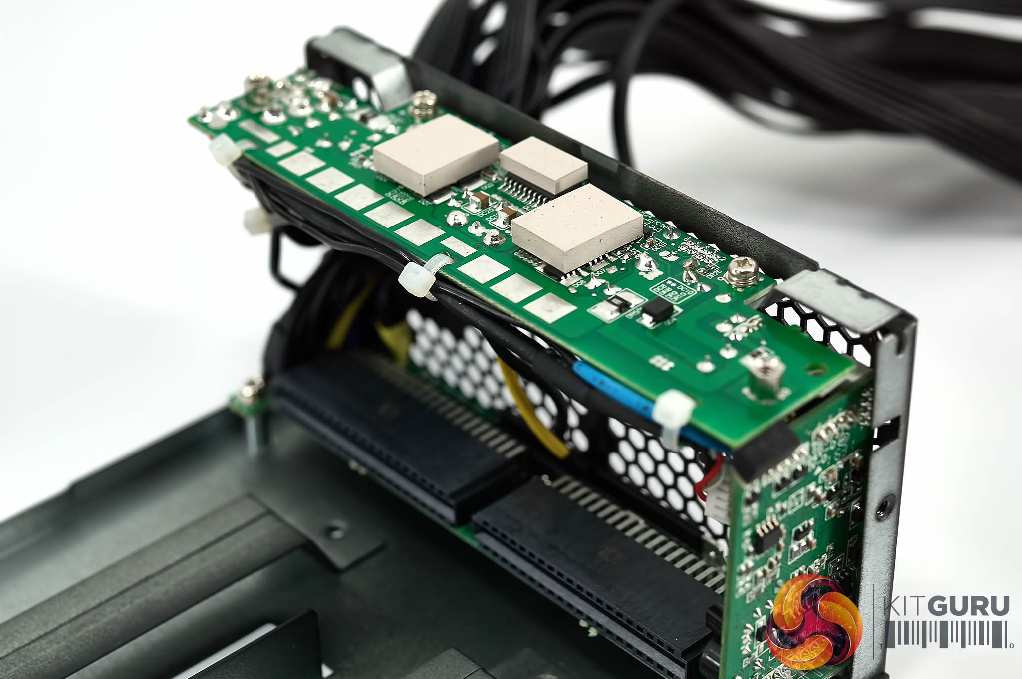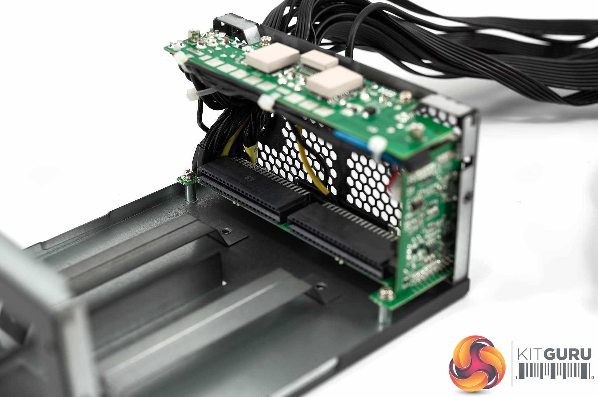 Internally, the OEM design is obviously by FSP. The two modular units plug into the main ATX chassis shown earlier on this page. There are multiple boards in the front that will handle the power distribution between the units. Remember when both power supplies are working fine, they share the load. The +3.3V, +5V and +12V outputs are generated on the main PCB inside the chassis. FSP adopt current limiters to switch the +12V output from the modular supplies into three 16A +12V outputs.