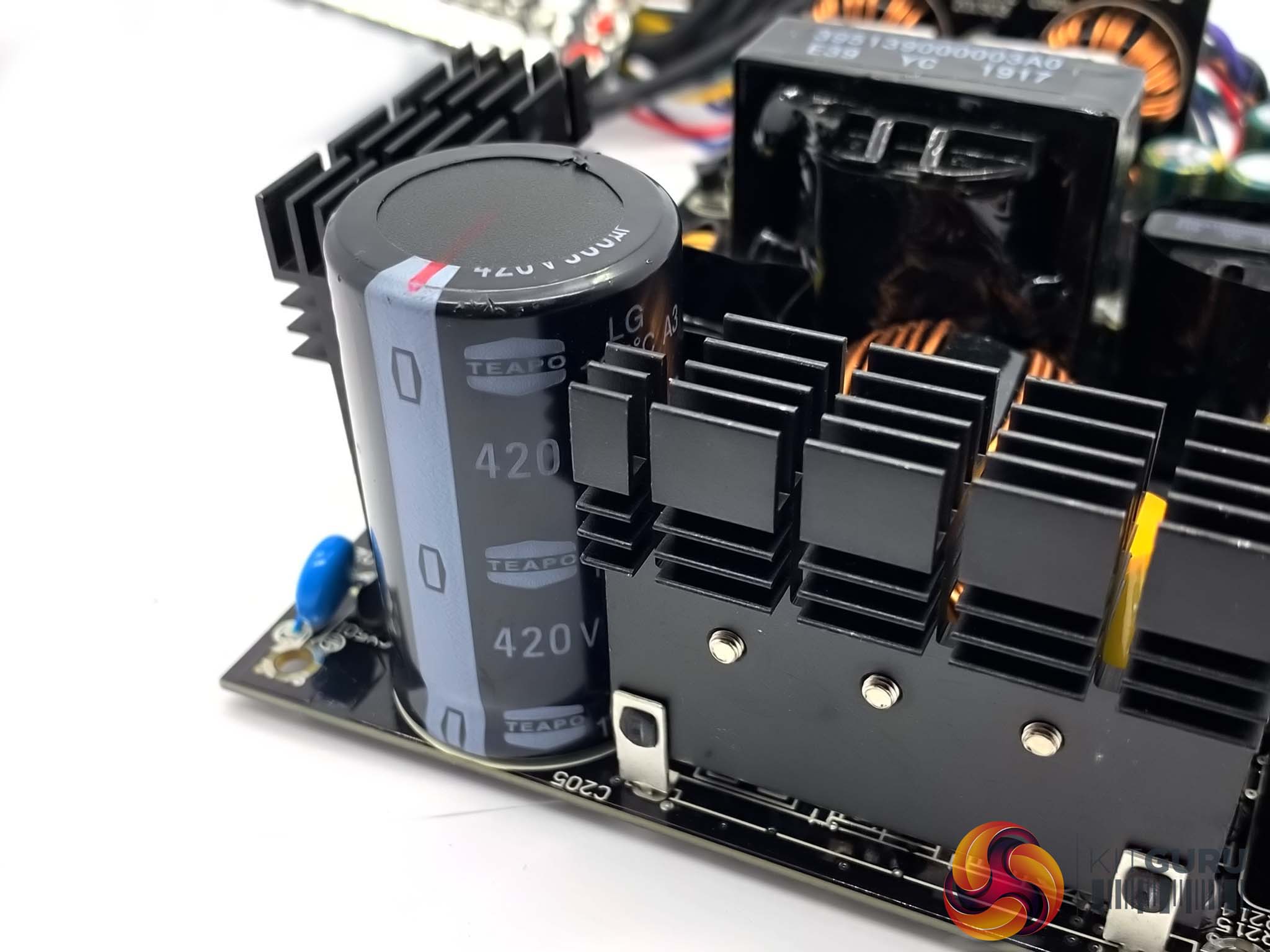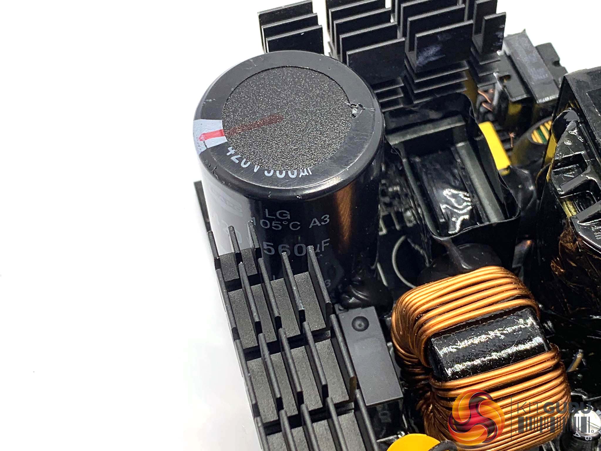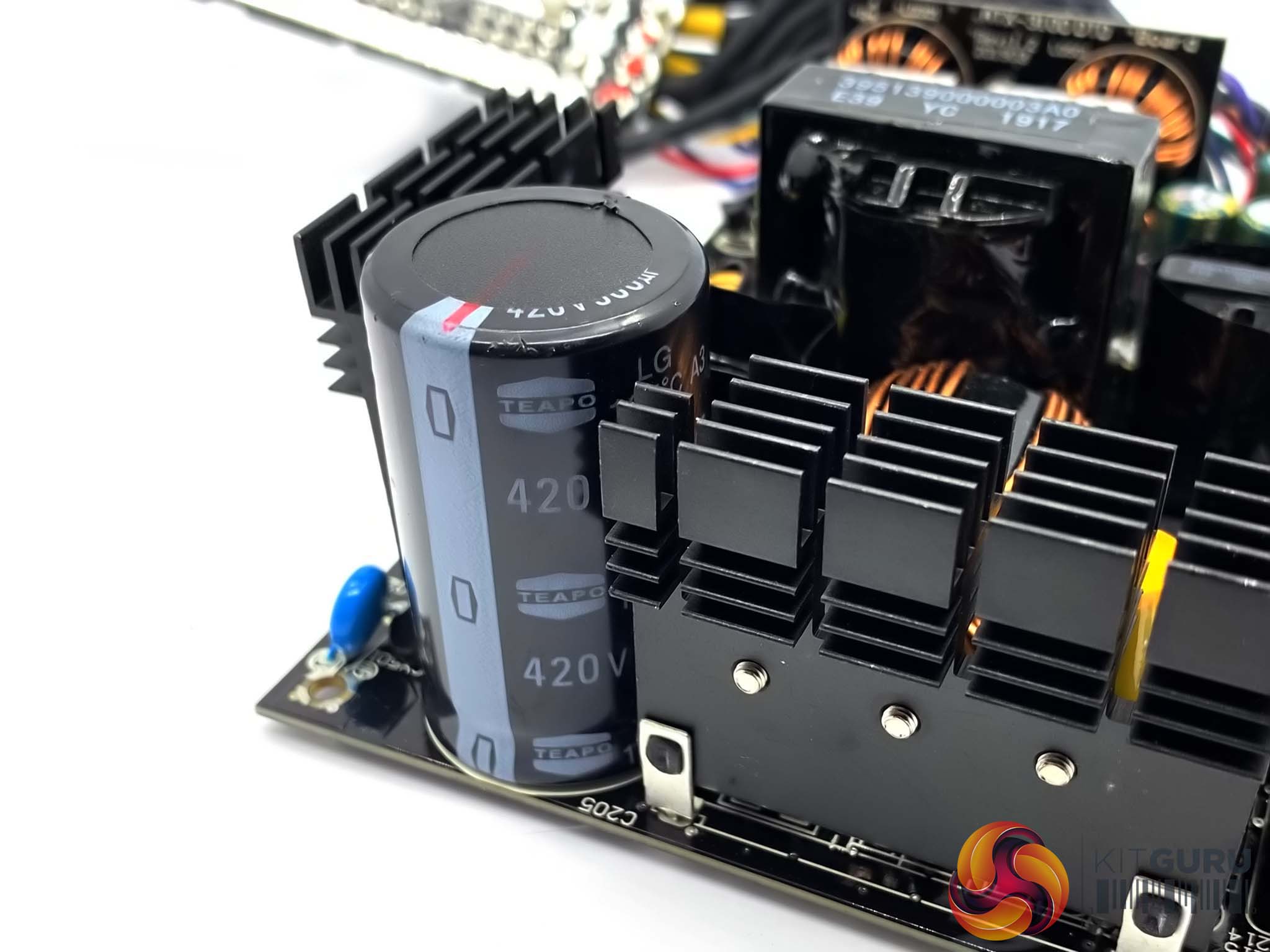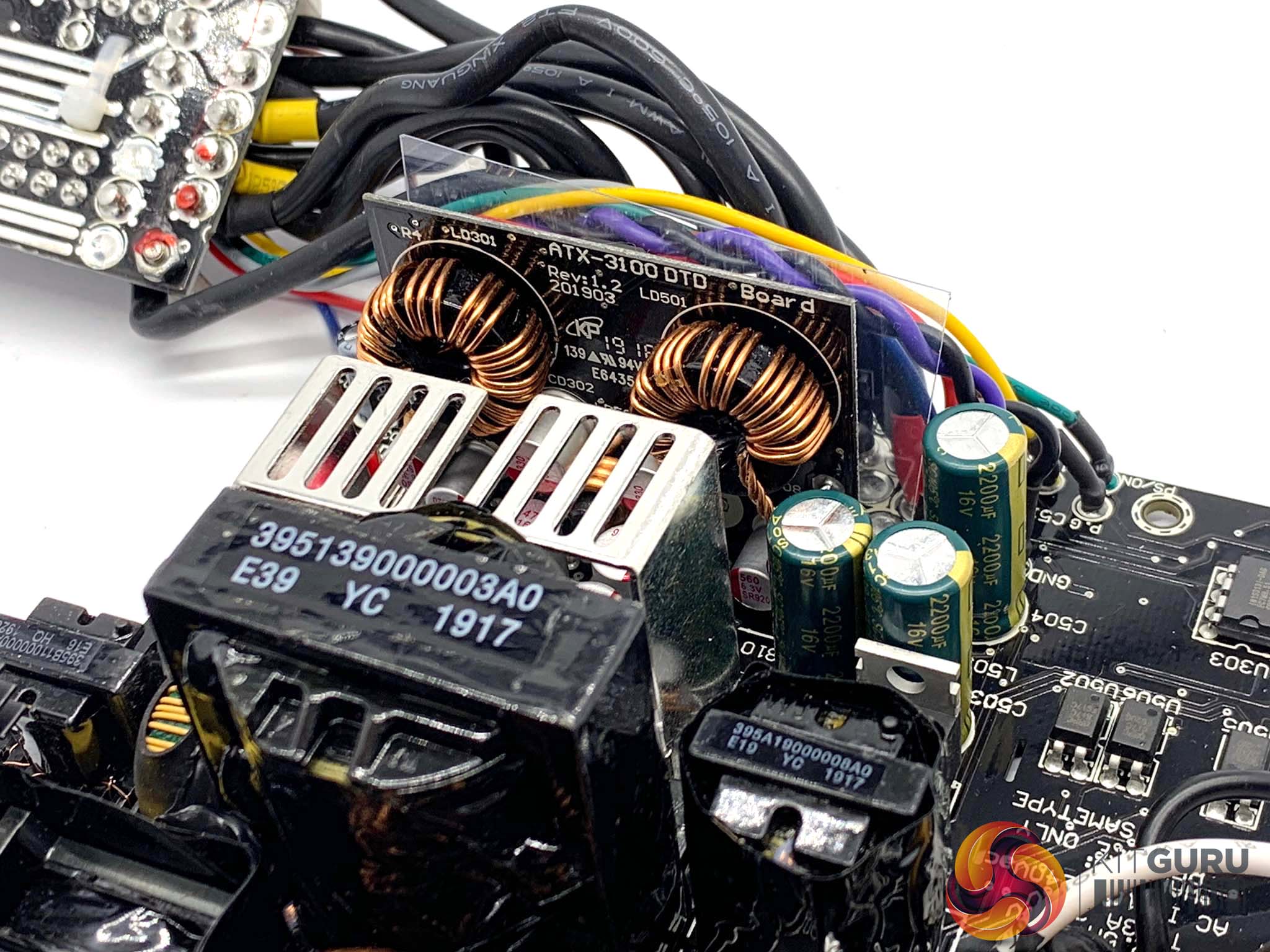 This Kolink developed design is using Teapo capacitors, a cost effective Chinese brand I have had bad experiences with in the past. Some people have told me their engineering processes are improving all the time, and to be honest at this price point I had certainly not expected to see Japanese capacitors inside the power supply. The primary hold up capacitor is at least rated 105c (rather than 85c) – 420v 560uF. Kolink told me that may rotate between Teapo and Elite capacitors with ‘no guarantee between the two'.
