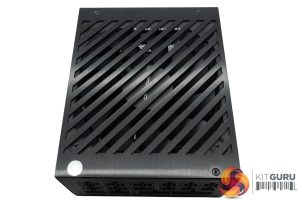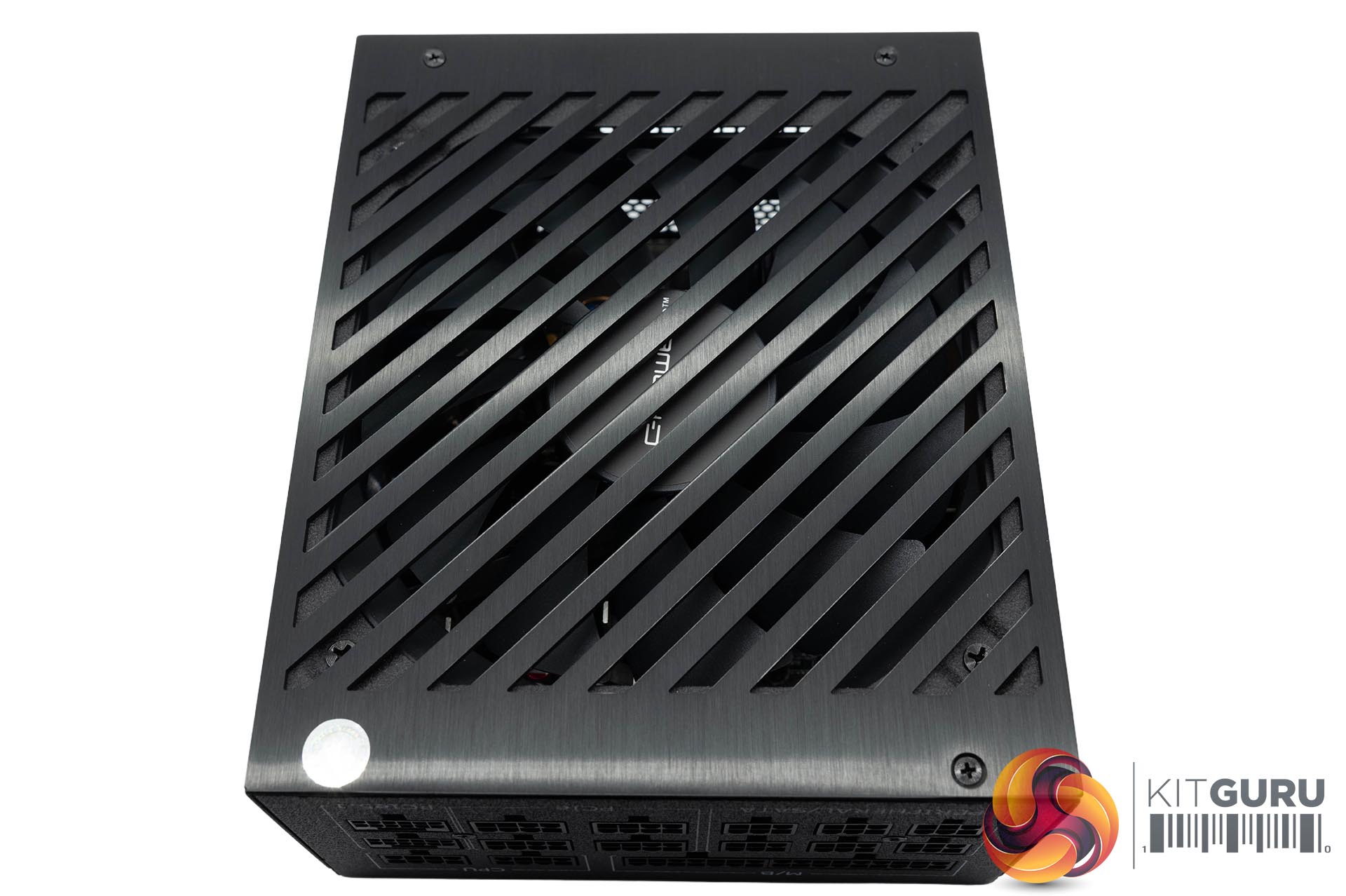 The top of the power supply has a brushed metal grille in place and the large fan is partially visible below it. If you remove the top panel you can see underneath a little better. We will take a closer look at the fan shortly when we open the PSU up properly.