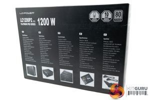 The LC-Power LC1200P2 ships in a box which features a high resolution image of the unit on the front and a list of three key details on the right side. These include the 80 Plus Platinum certification, the 10-year warranty and the adoption of high grade Japanese capacitors.