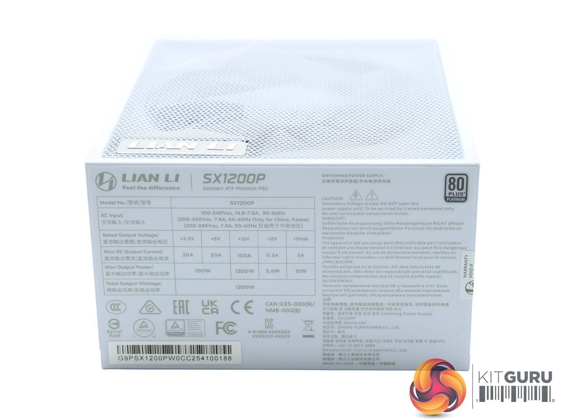 The unit is able to deliver 100A on the primary +12V rail, and 20A on both +3.3V and +5V rails. Total output is 1200W.