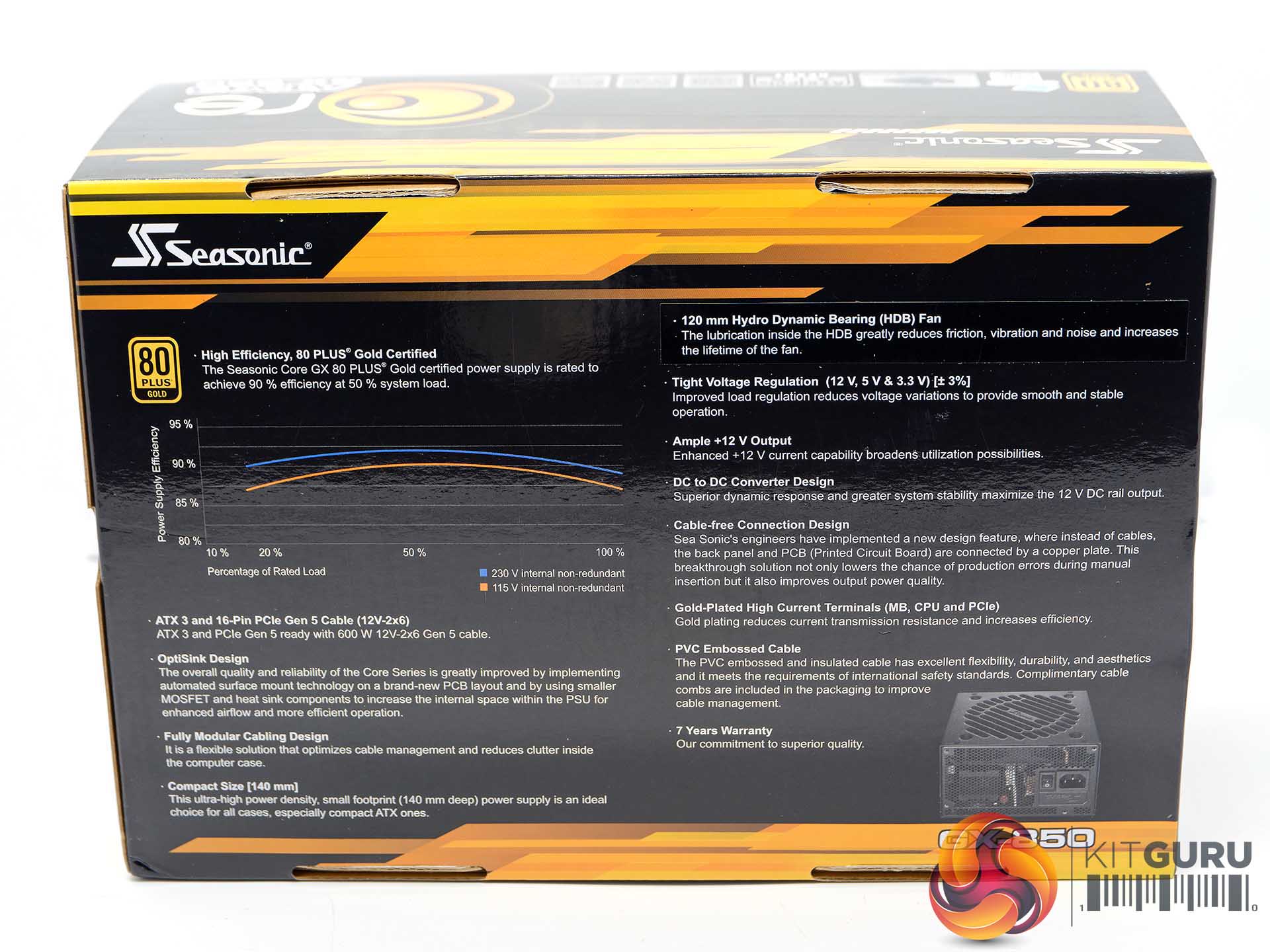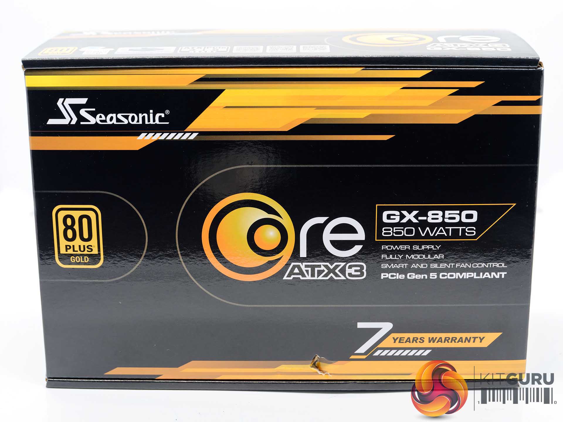 The Seasonic Core GX 850 ships in a brightly yellow accented box – no high resolution images of the power supply are on show, it is just a generic design with a modest 7 year warranty listed on the front and the 80 Plus Gold Certification badge on display. Yet again, no Cybenetics badge approval on the front which is surprising to see.