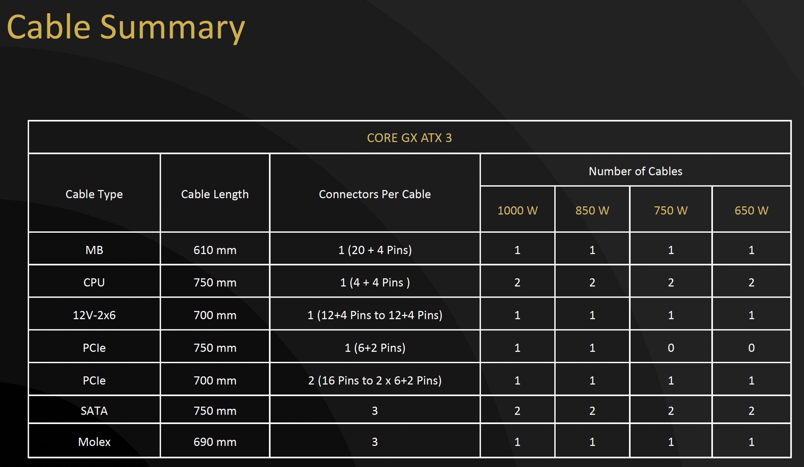 The table above shows a list of cables for each of the units in this range. The 850W power supply I am reviewing today seems to have enough cables to suit a wide variety of mid power demand gaming systems. The cables are individually braided and look pretty good.