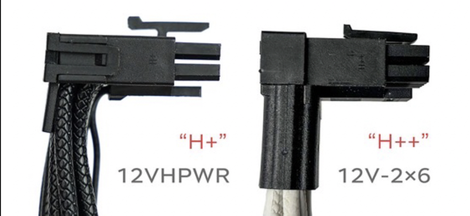 The 12VHPWR connector is marked with “H+” and the 12V-2×6 connector is marked with “H++” to indicate a pin/terminal that supports 9.2A or higher current. Both connector types support up to 600W output power.