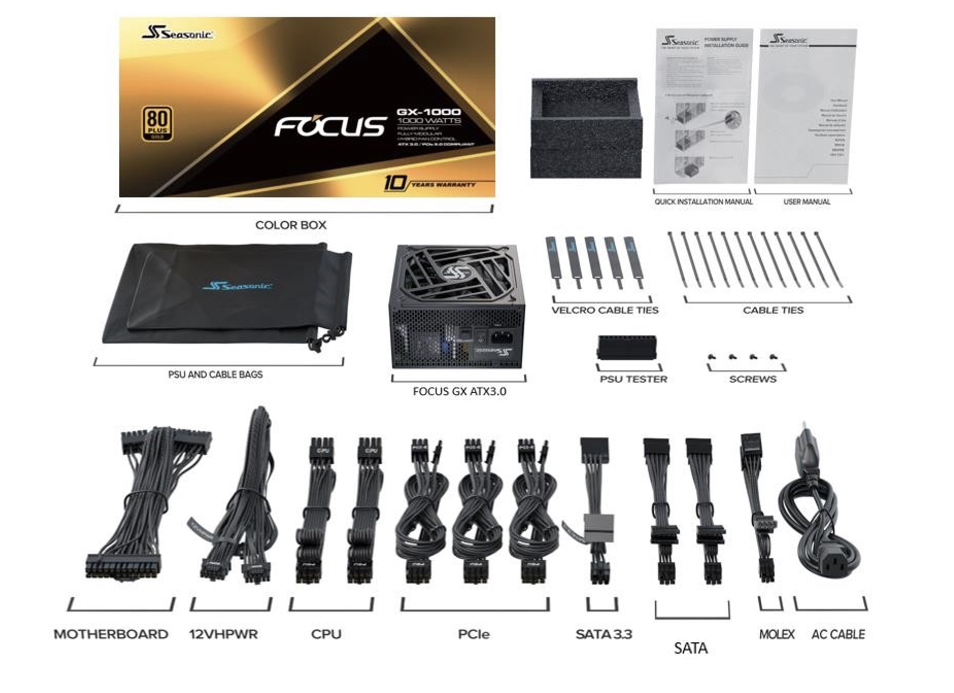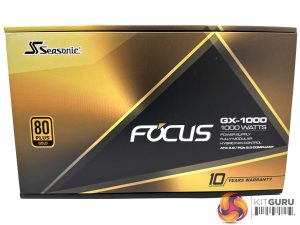 The Focus GX-1000 power supply ships in a bright gold coloured box with no image of the unit on the front – just a list of key specifications along with the 10 year warranty.