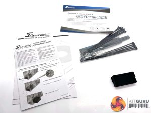 The box contains some literature on the product, as well as cable ties and a PSU tester. They also supply a regional specific power cable. Seasonic wrap up all the modular cables in a bag.