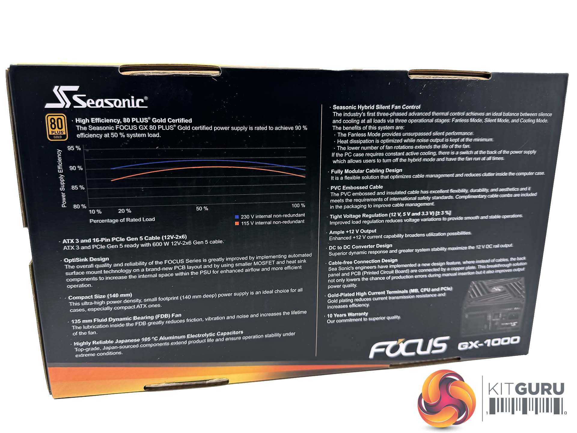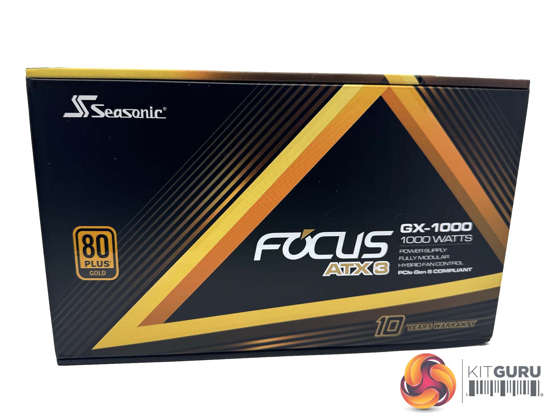 The Focus GX-1000 box doesn't have any images of the PSU itself on the front – there are just some key selling points, including the 80 Plus Gold sticker, the 10 year warranty, hybrid fan control, modular configuration, and ATX 3 / PCIe 5 compliance.