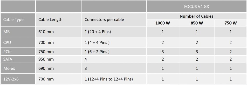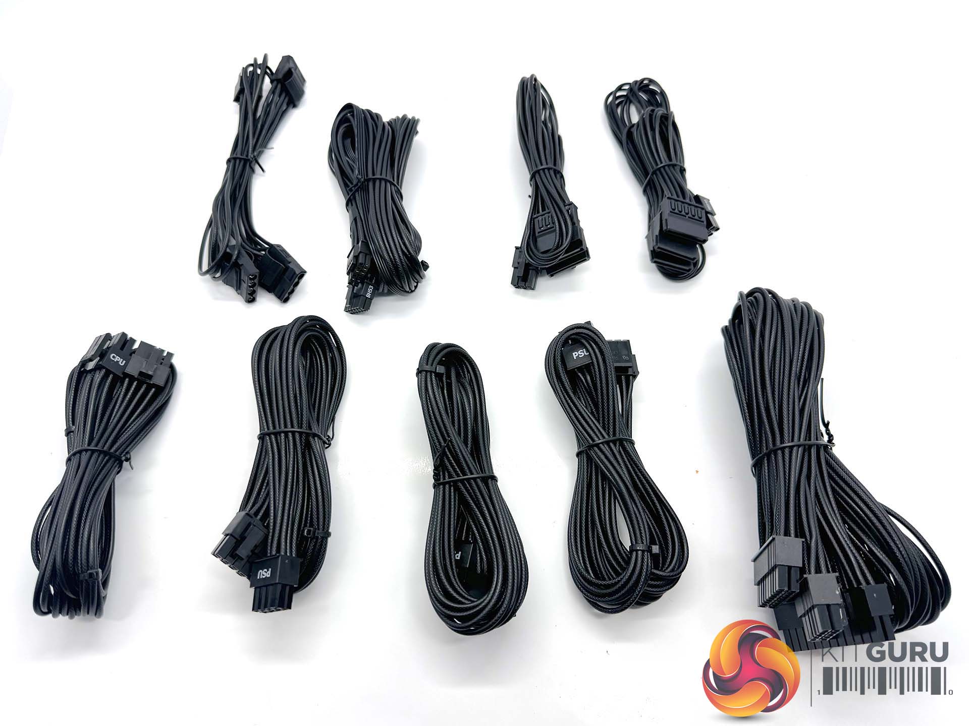 The modular cables are high quality and individually sleeved. The updated 12V-2×6 cable is 16 AWG gauge with a maximum rated power of 600 Watts.