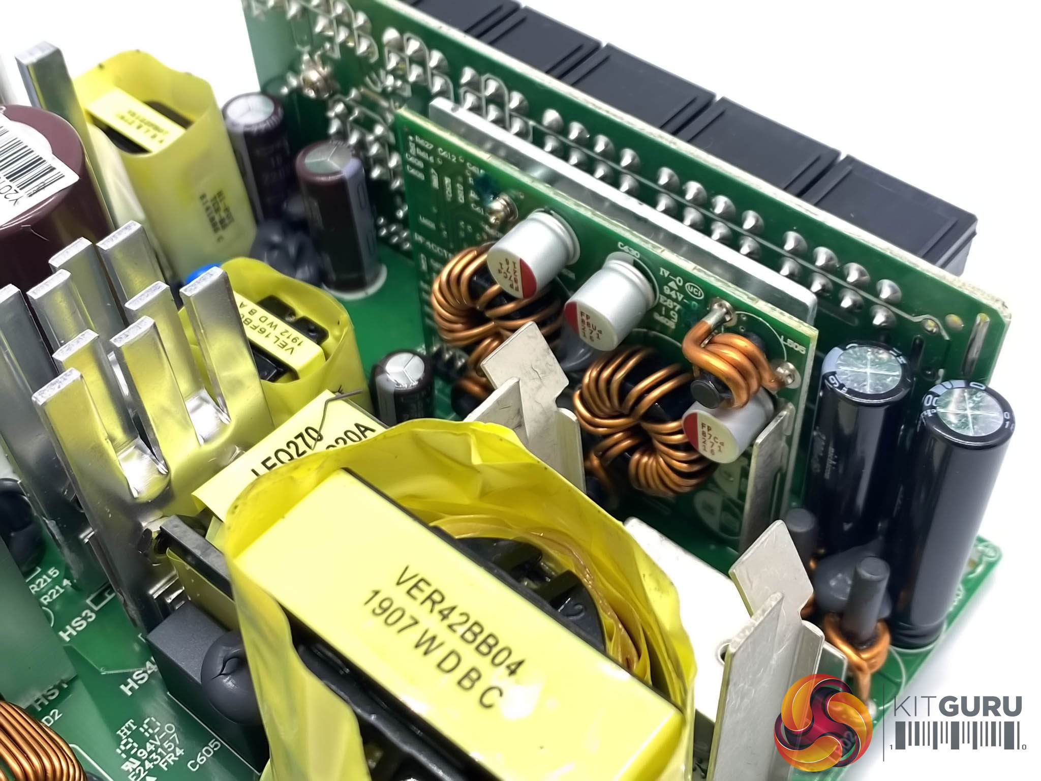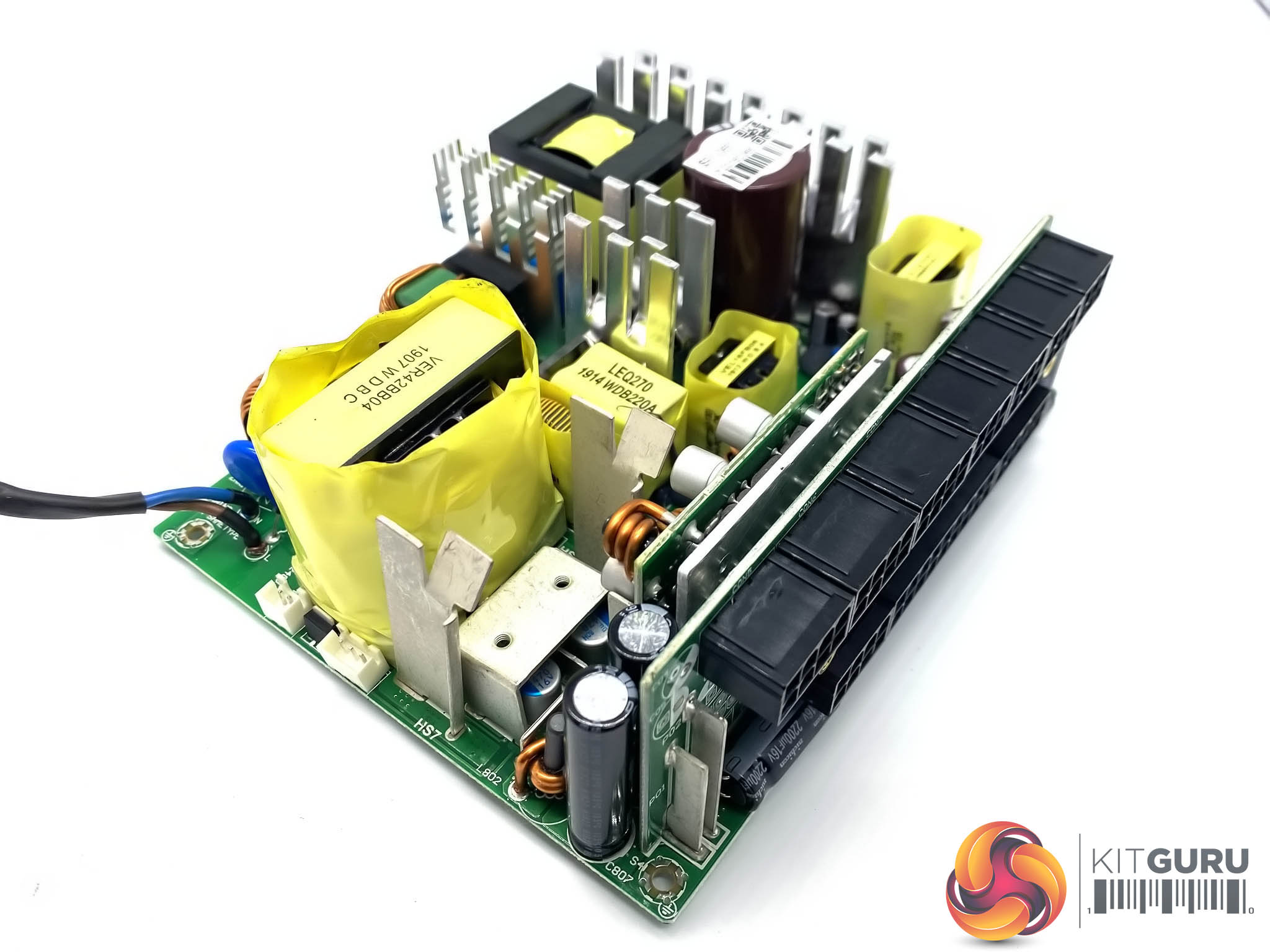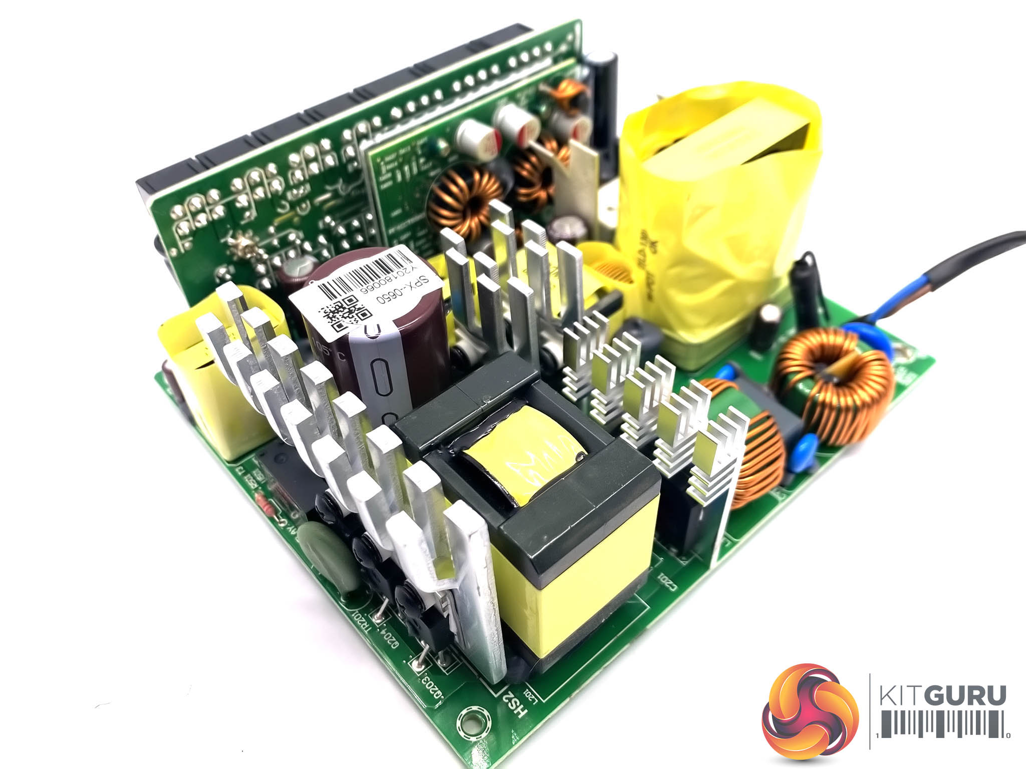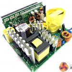 This design is a full bridge topology on the primary side along with an LLC resonant converter. On the secondary side FET's installed on the PCB's solder side rectify the +12V rail. Minor rails are generated through a couple of DC-DC converters.