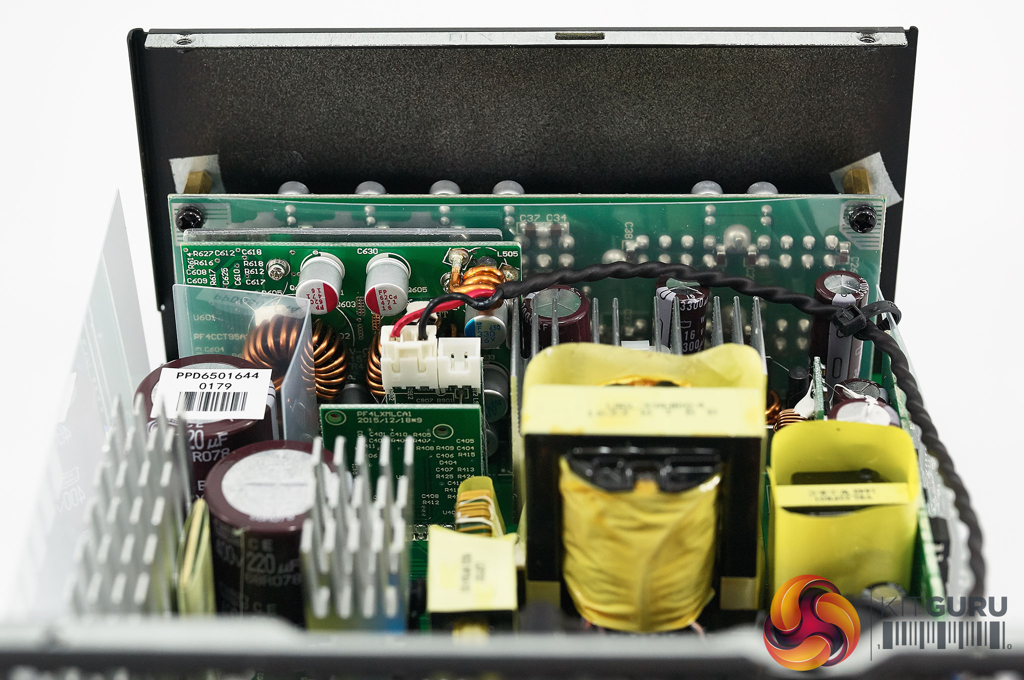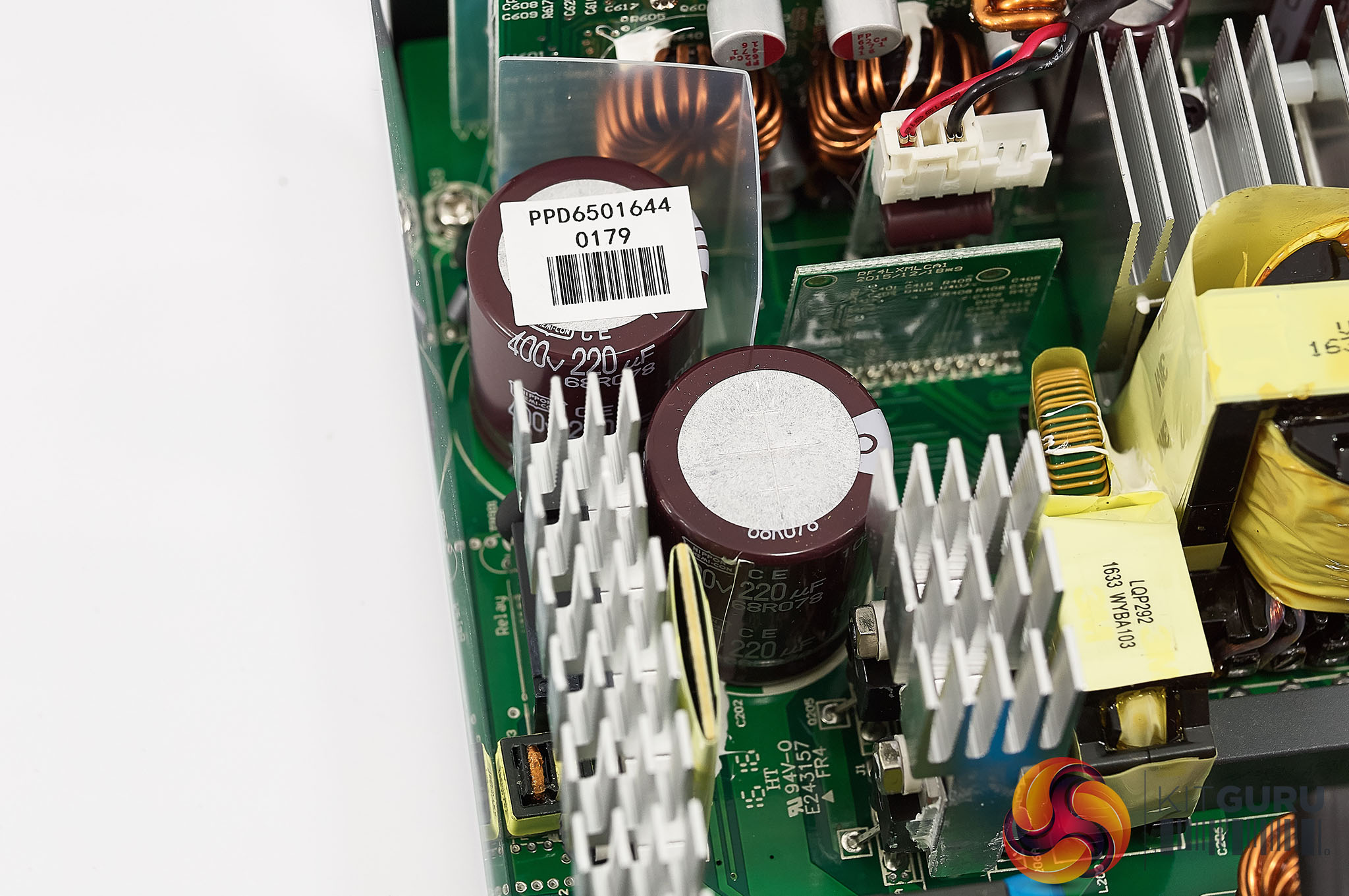 The two primary Nippon Chemi Con capacitors are 105c rated and 400v 220uF to produce a total of 440uF. Checking back with our review of the Titanium PRIME 650W power supply from August 2016, we can see Seasonic massively over specified that unit, with two 450uF primary capacitors in the design to deliver a total of 900uF!