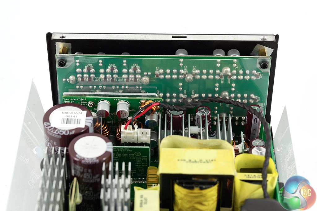 The 750W Prime which we reviewed last month is served by two 105c Nippon Chemi Con capacitors rated at 400v 560uF and 400v 450uF (for a combined total of 1010uF).