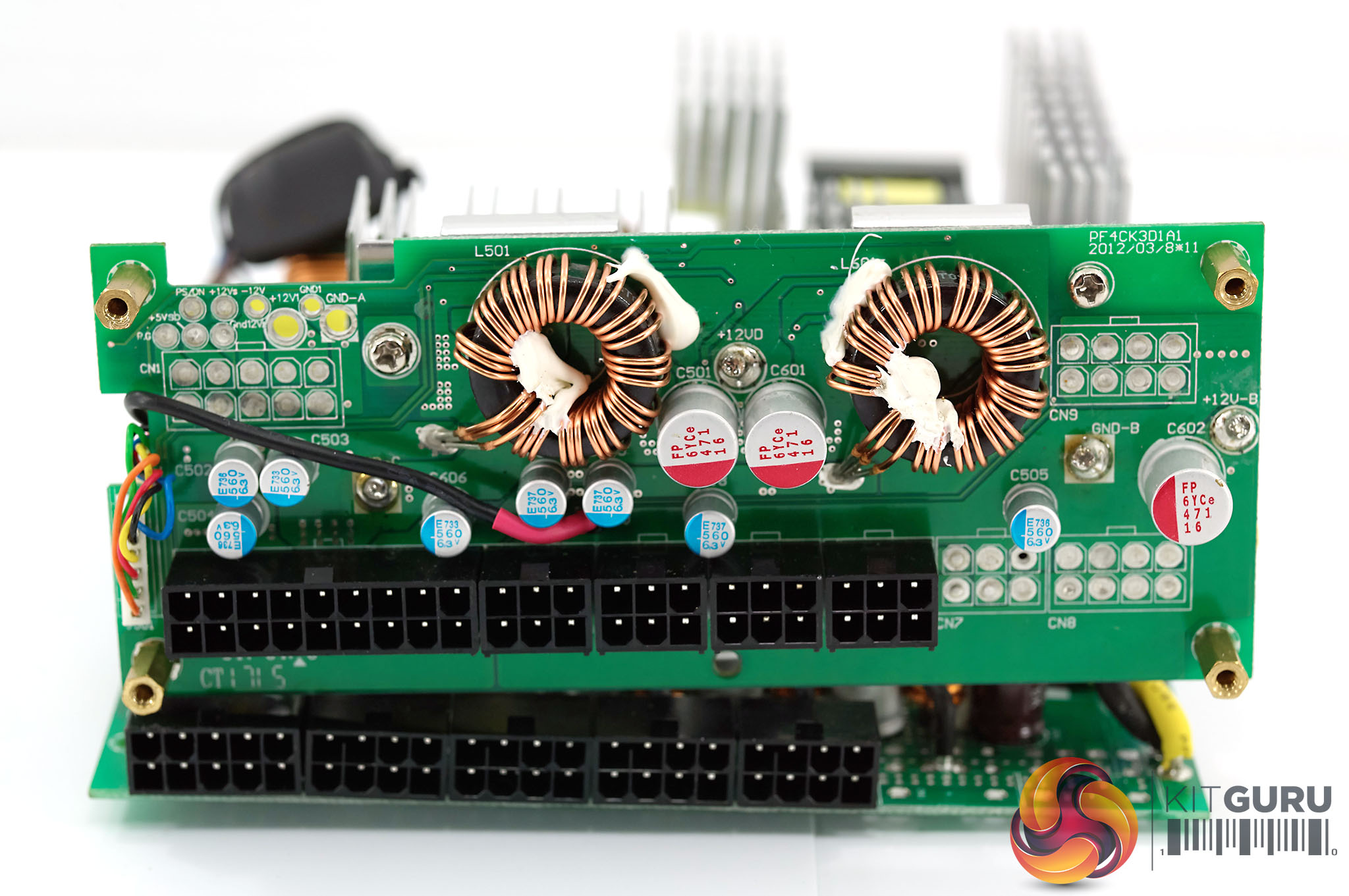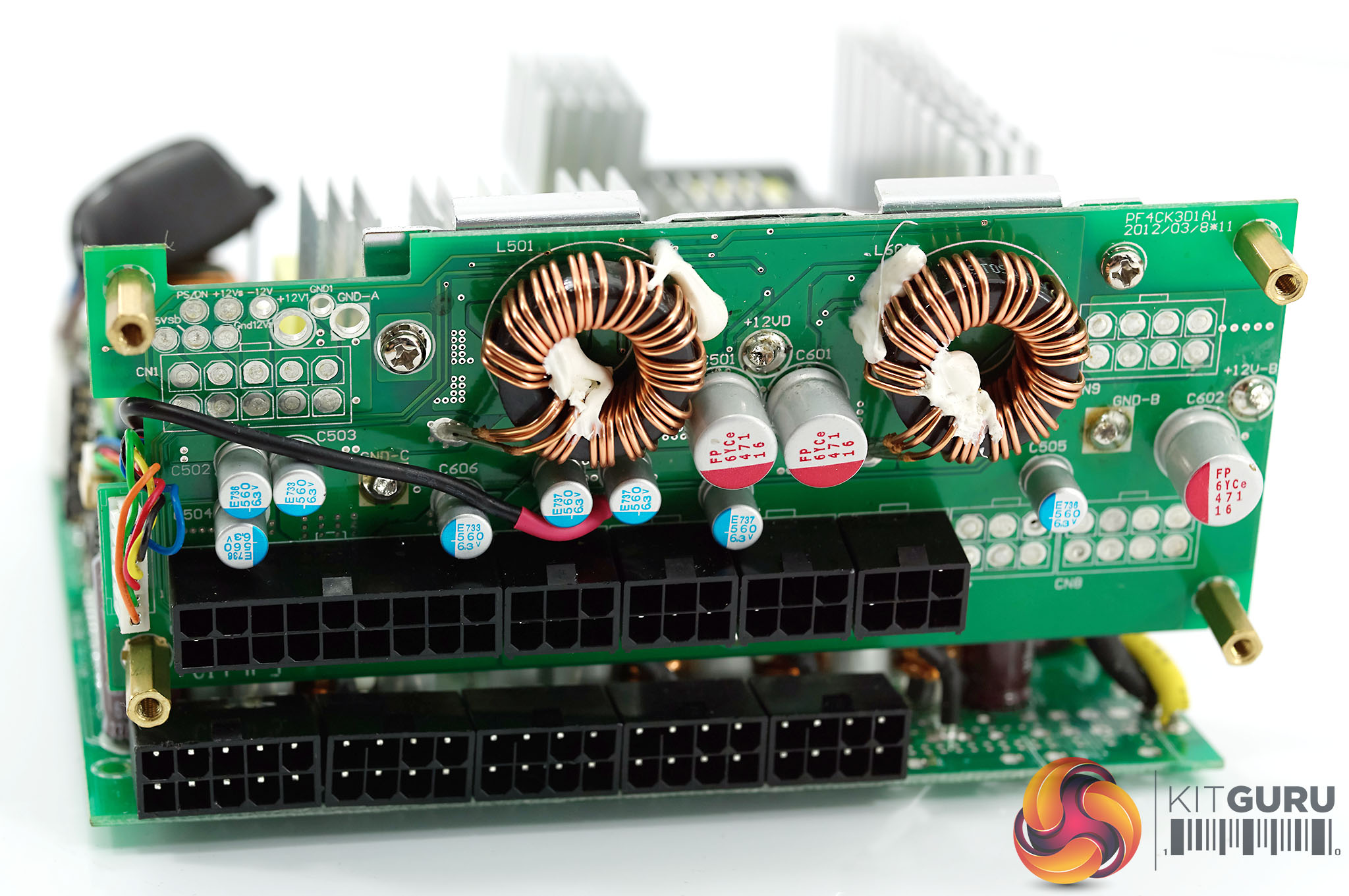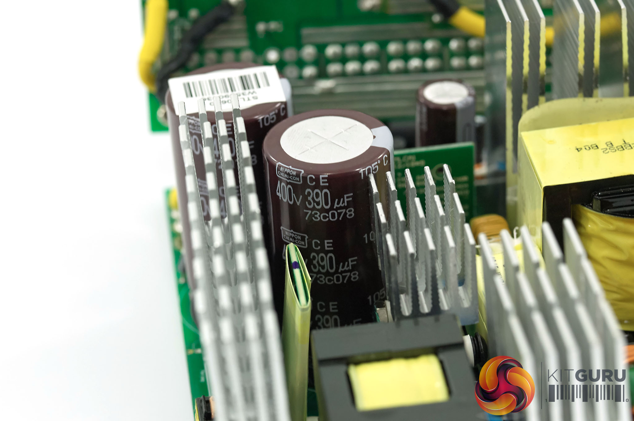 As we would expect, Seasonic are using high grade 105c Japanese capacitors throughout the design. They have adopted two 105c rated Nippon Chemi Con capacitors in the primary stage, rated 400v 390uF and 400V 450uF. This gives a total output of 840uF which seems somewhat overspecified to me. I have spoken to Seasonic in the past about their choice of capacitors and they confirm their reasoning is to keep RMA's as low as possible. We all like that.