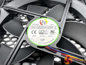 Inside the power supply is a Hong Hua fan, marked HA13525H12SF-Z – a favourite with Seasonic and many other brands. This is a 135 Fluid Dynamic Bearing (FDB) fan, which you can disable under lower load situations with the switch on the back of the unit.