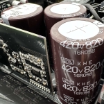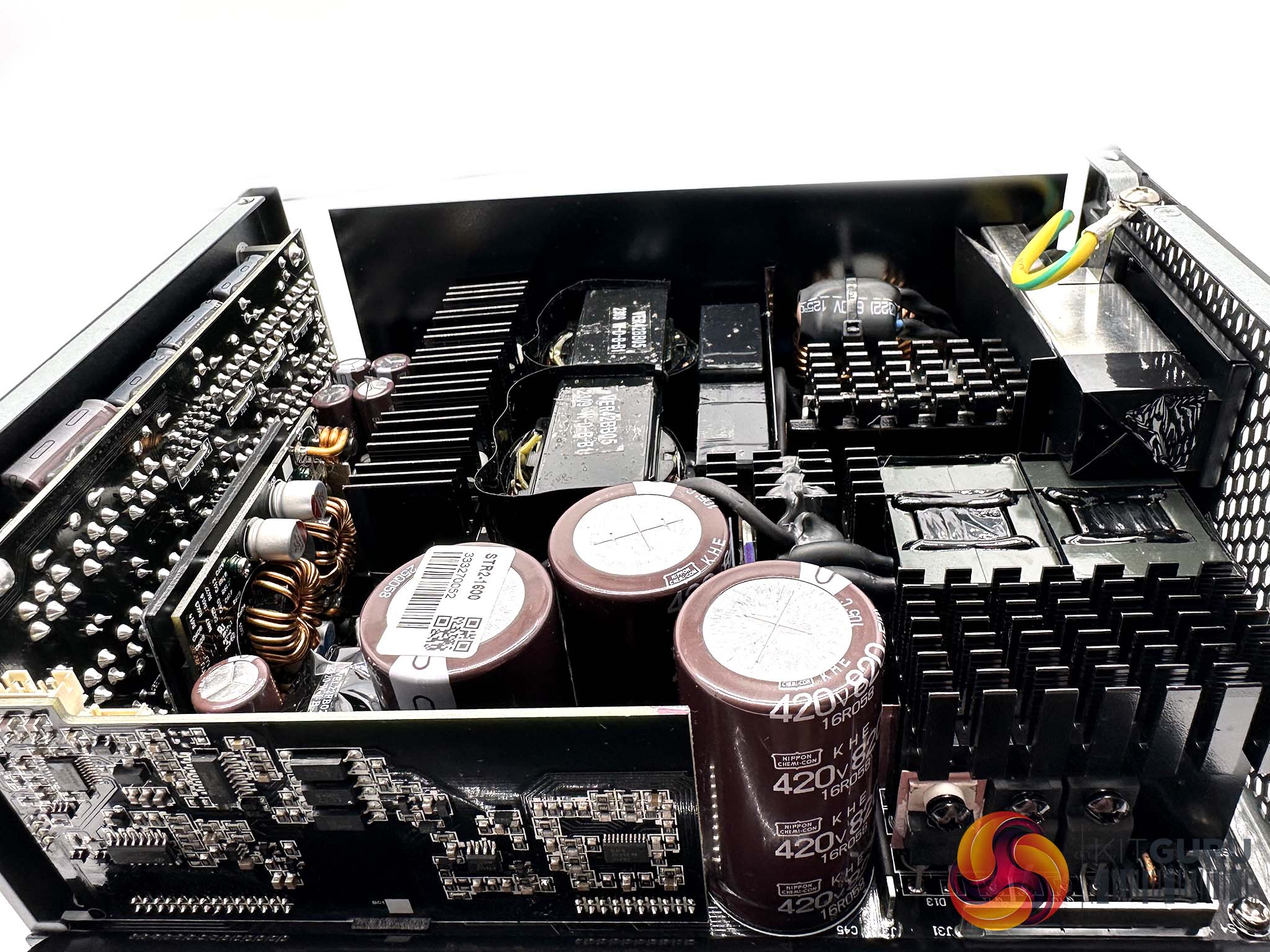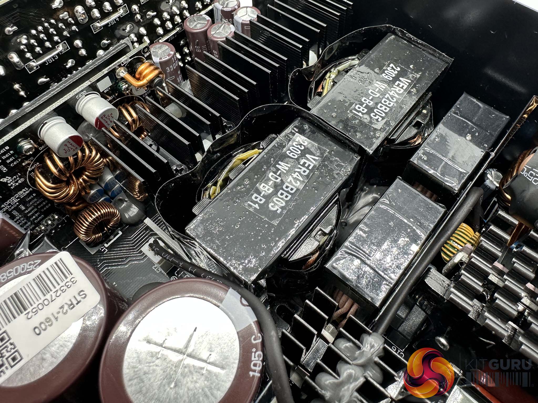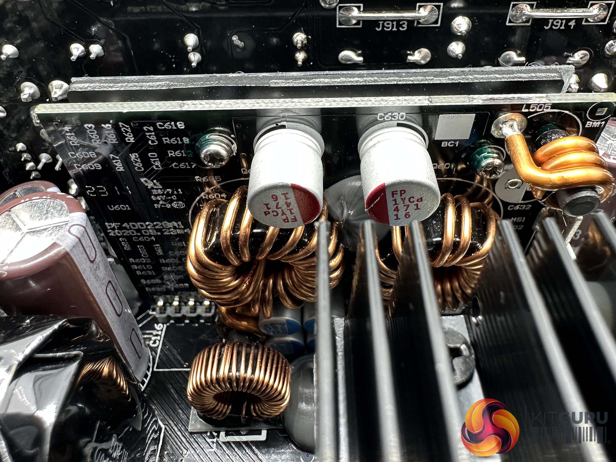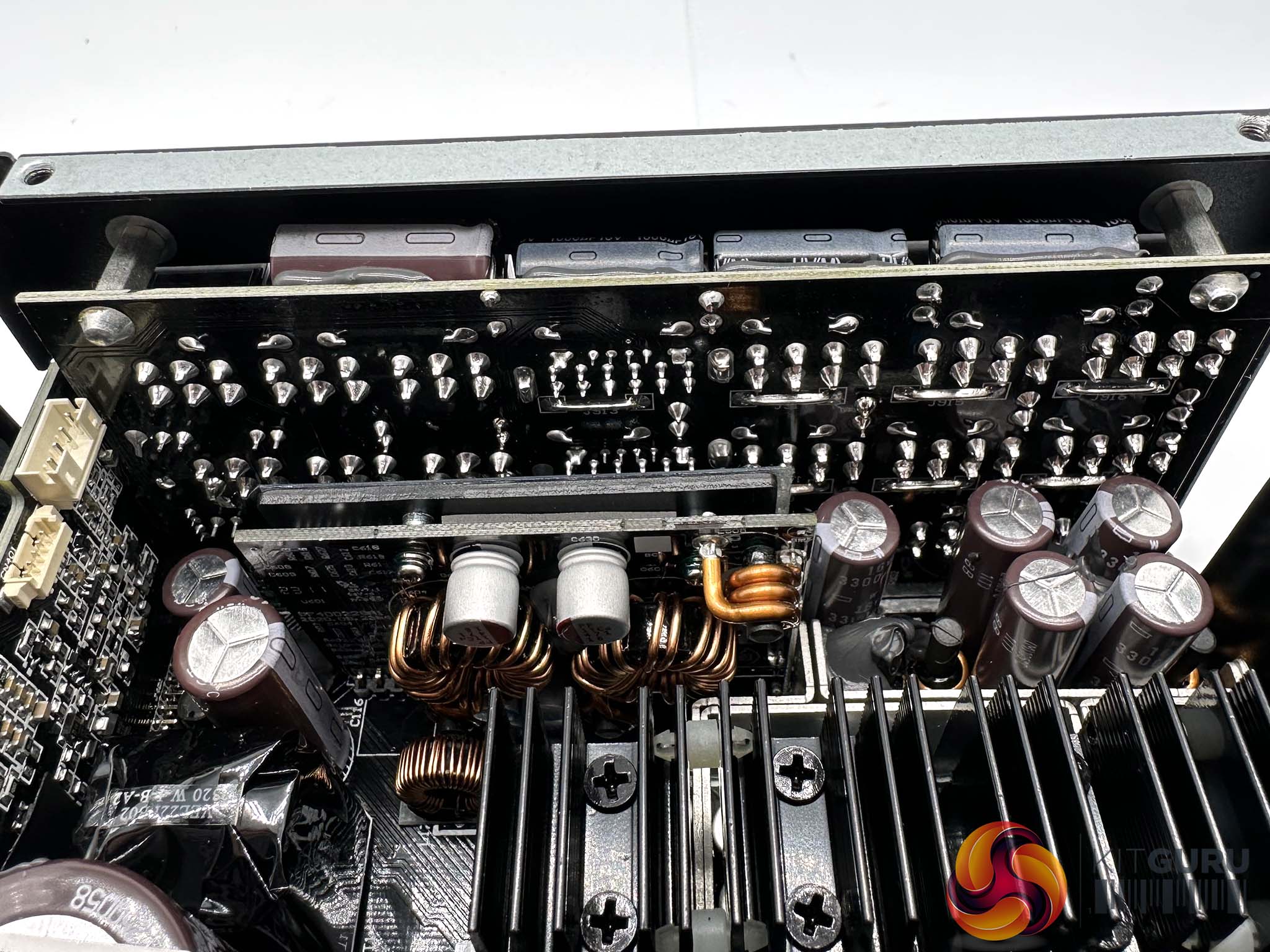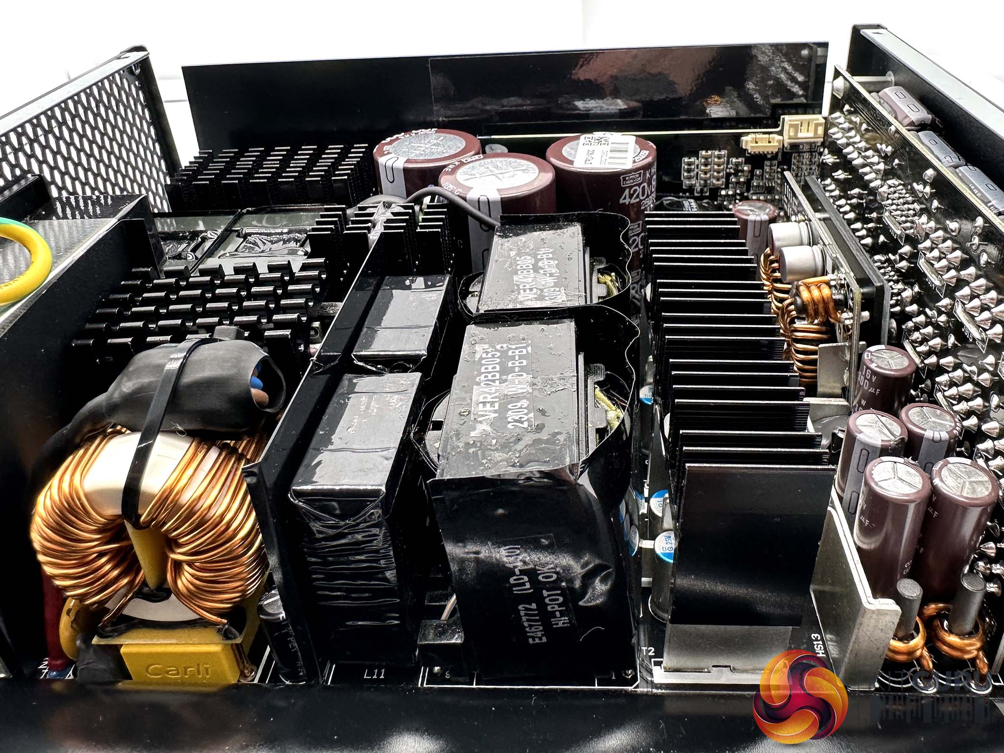 Seasonic are using high grade 105C Japanese capacitors throughout the design, with high grade Nippon Chemi Con caps making up the primary stage. Three massive 420v 820uF capacitors deliver a total of 2460uF. This is significantly higher uF than the 2022 version of this supply which we reviewed back in September 2022 (HERE). Due to this massive capacity we noticed Seasonic have used dual NTC thermistors with 20ohm x2 resistance. These are installed on a vertically mounted board into the main PCB to save horizontal foot print.