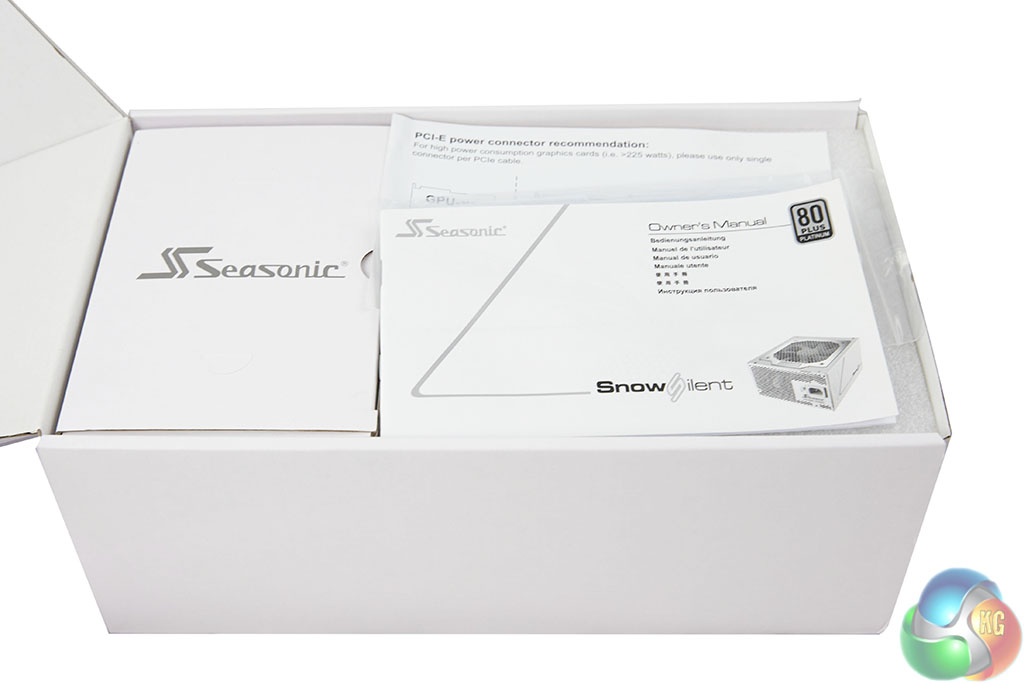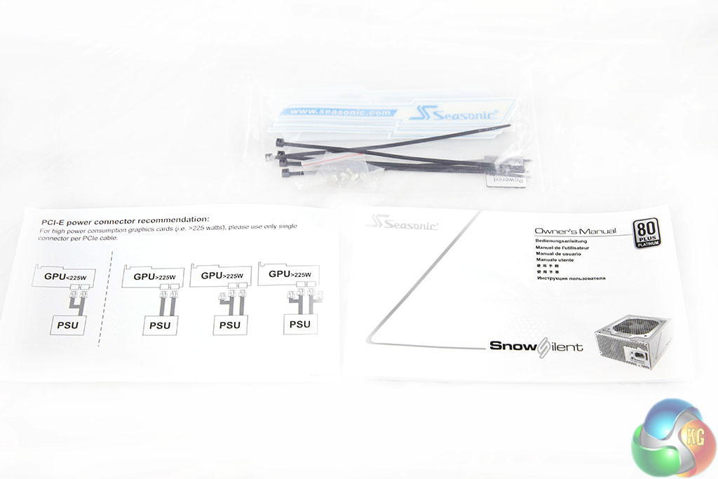 Seasonic bundle a user manual, cable ties, and mounting screws. They also include a reference sheet to help with cable connection to graphics cards. Basically if you are using a graphics card which takes more than 225watts under load then use two separate PCIe power cables rather than two headers on a single cable.