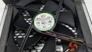 Inside the power supply is a Hong Hua fan, marked HA13525H12SF-Z – a favourite with Seasonic and many other brands. This is a 135 Fluid Dynamic bearing fan – which you can disable under lower load situations with the switch on the back of the unit.