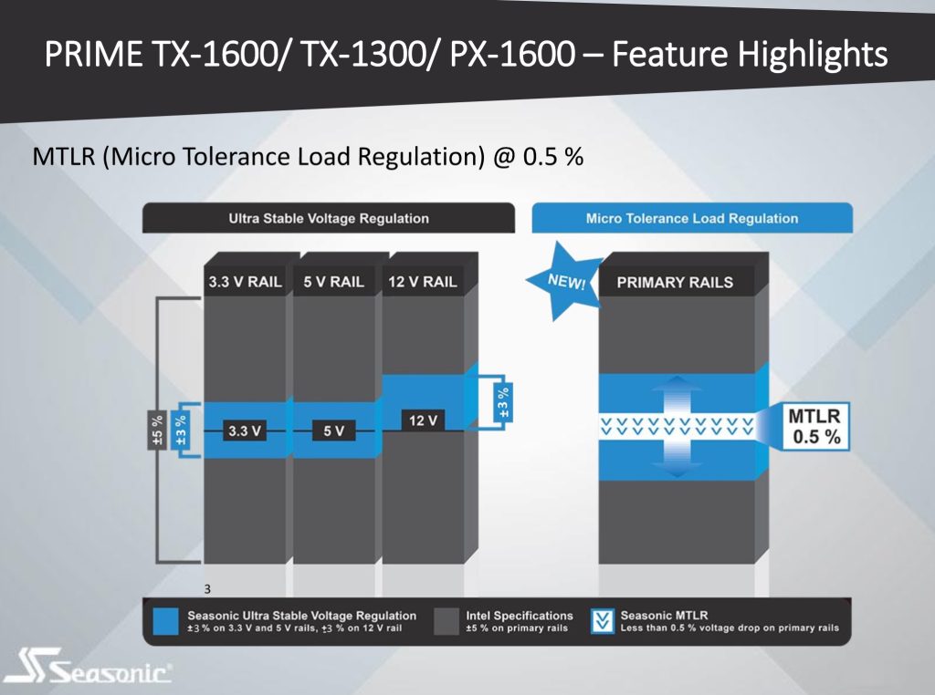 Seasonic are keen to promote their ‘MTLR' (Micro Tolerance Load Regulation) which is rated to deliver less than a 0.5% voltage drop on the primary rails.