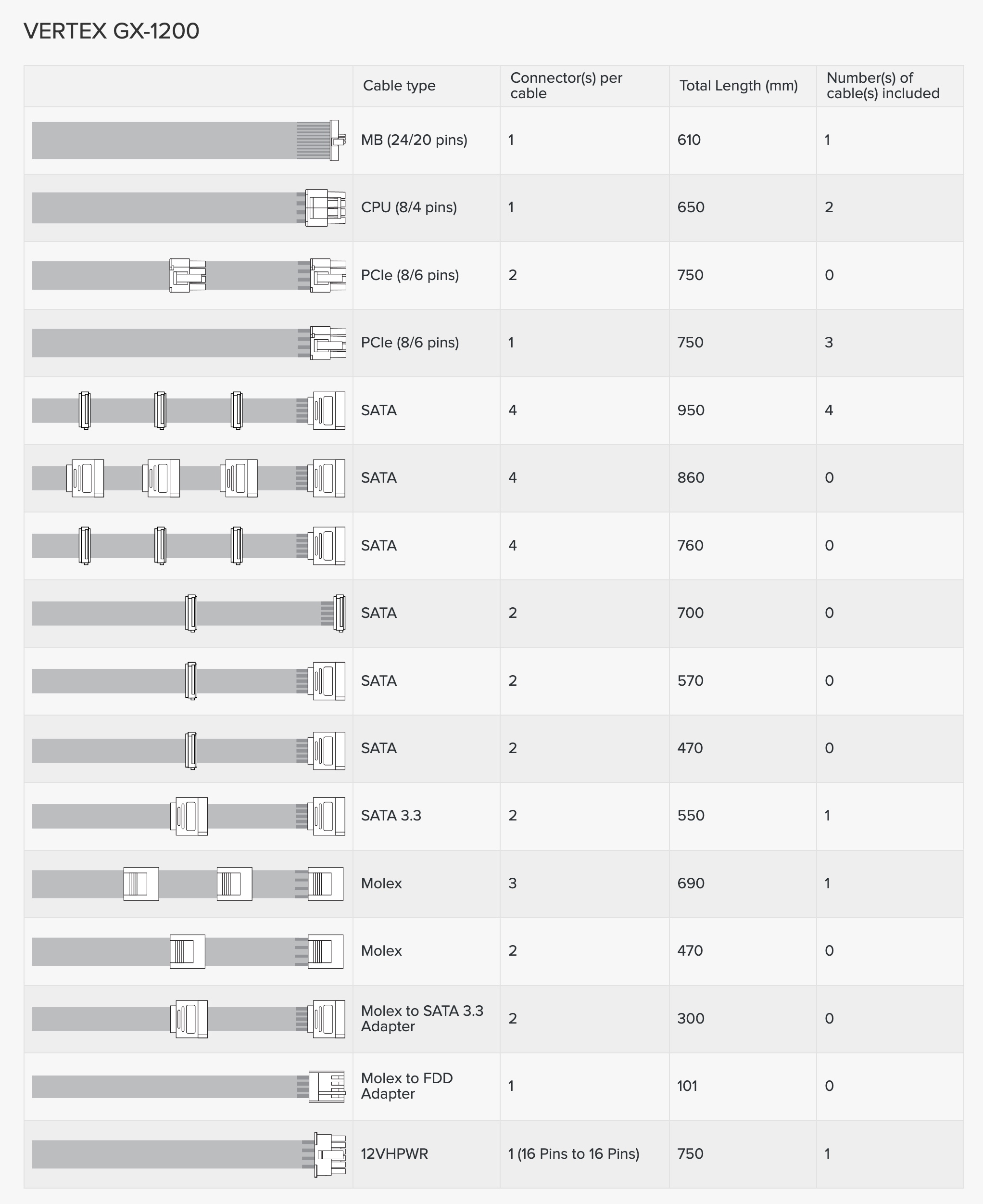 The Vertex GX-1200 is supplied with a plethora of cables, including a 12VHPWR, which measures 750 mm in length. All are high grade and individually sleeved.
