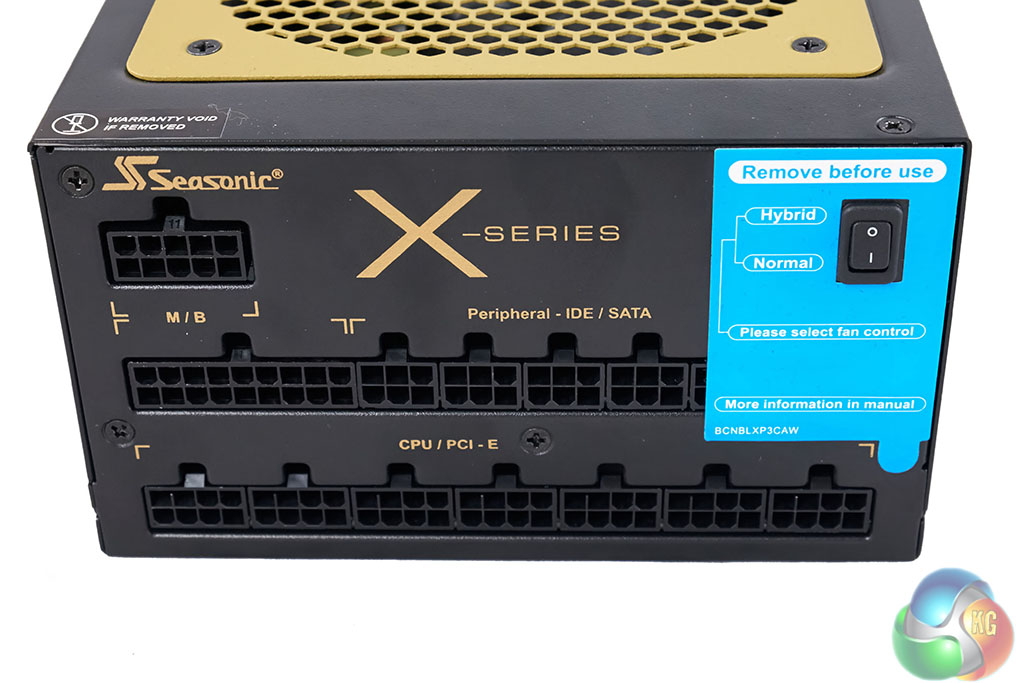 There are several rows for the modular connectors and Seasonic have labelled them clearly to aid with the build phase. There is a sticker on the right which indicates the dual switch operation of the fan – hybrid and normal. You should remove this sticker before installing the unit.