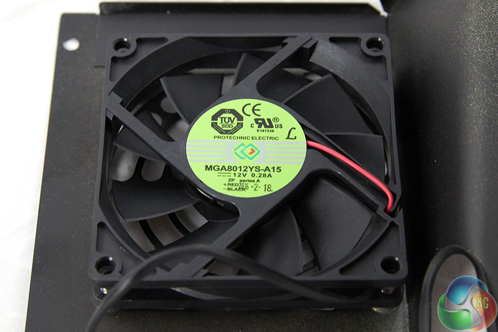 The 80mm fan is made by Protechnic Electric with part number MGA8012YS-A15. This fan is rated 12V 0.28A. Little information can be found online although some investigation would indicate that fan speed peaks at 3,800 rpm. We do hope it doesn't spin close to this speed, as it will likely be rather loud, given the small physical dimensions.
