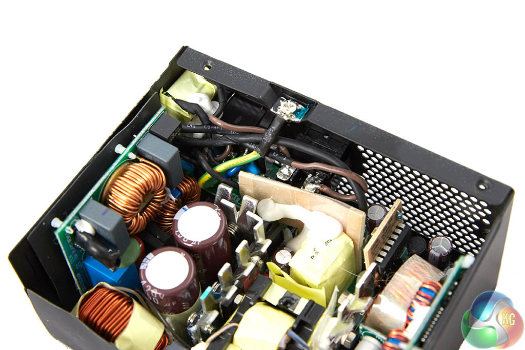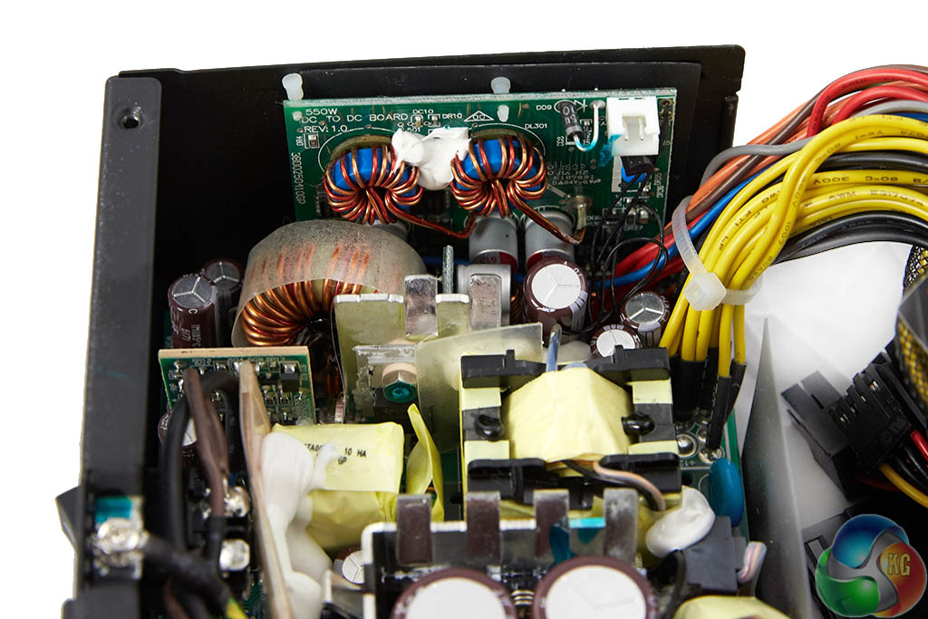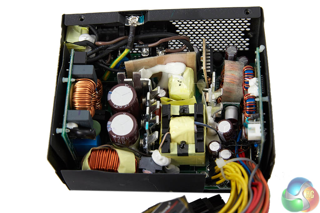 This Active PFC power supply is an FSP OEM design for SilverStone. I thought initially this might be an active clamp with group regulation configuration. There is a DC to DC daughterboard shown close to the bunch of hard wired cables. The two primary capacitors are rated 420V 150uF and secondary stage capacitors are rated 105c which is good to see, especially in such a space restricted design. General soldering quality is decent, if unremarkable.
