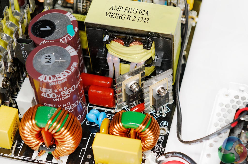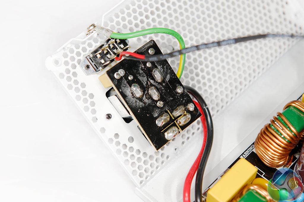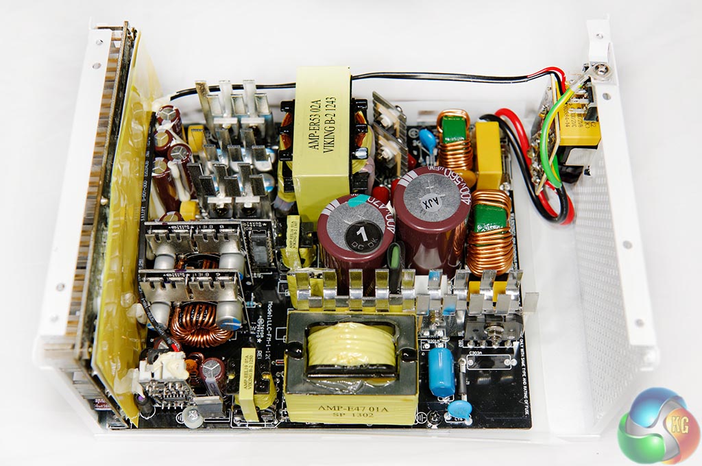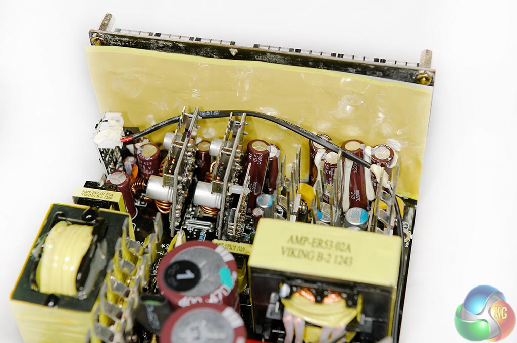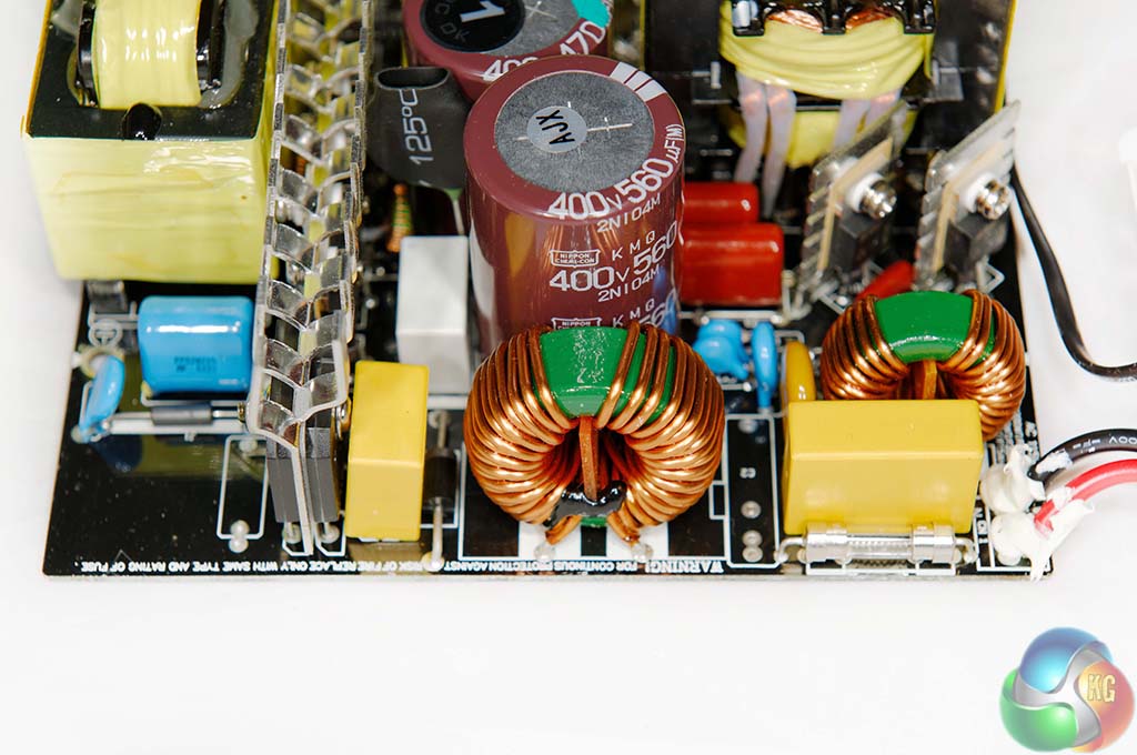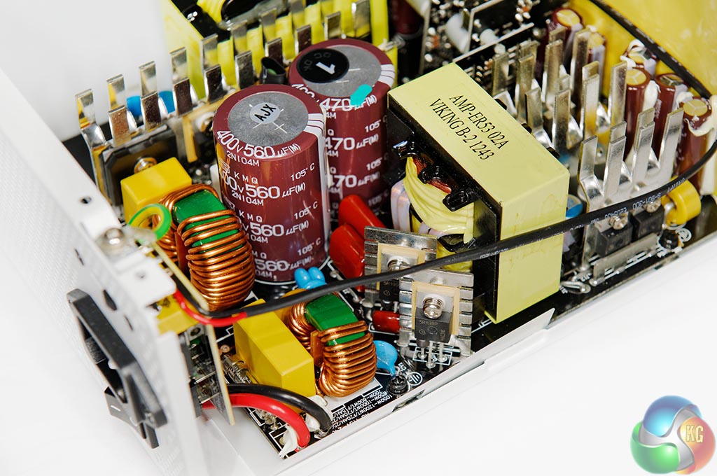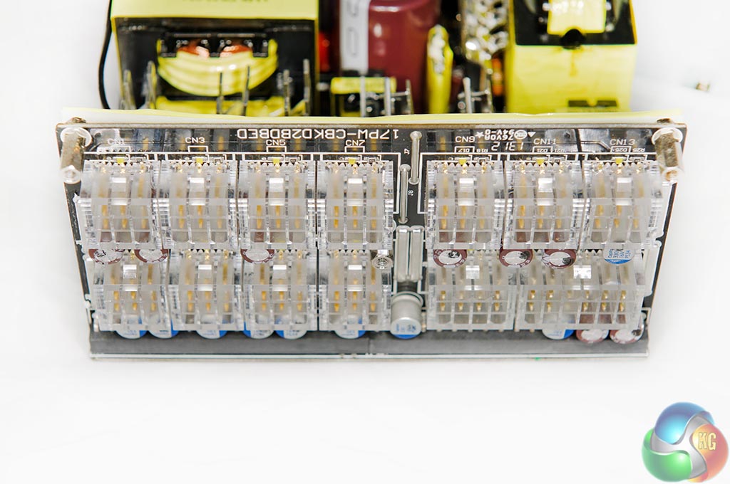 Super Flower are using the highest quality Nippon Chemi Con Japanese capacitors (KMQ series) rated at 105c. The primary capacitors are rated 400V 560μF and 400V 470 μF. We were surprised to see quite a lot of glue holding the fan control wiring in position – if this came loose it could potentially get tangled up in the fan above. This cable stretches across the full length of the power supply which is not an ideal layout really.