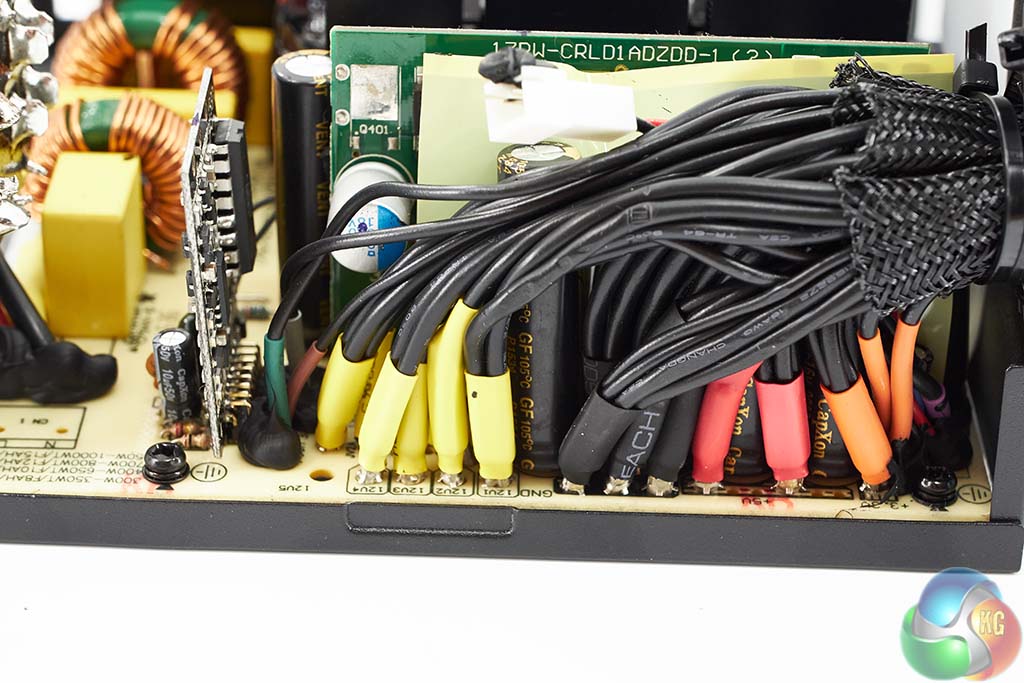 The Super Flower design is quite clean although I did notice some less than stellar PCB soldering, including some hand made solder joints. The primary capacitor is Japanese branded Nippon Chemi Con (SMQ series) – rated 400v 560uF. It is one of the lower 85c rated caps however, not 105c. Secondary stage capacitors are also 85c rated.