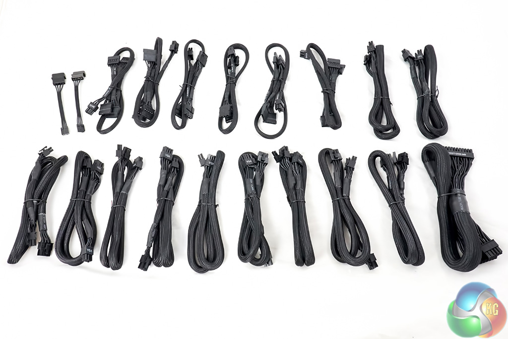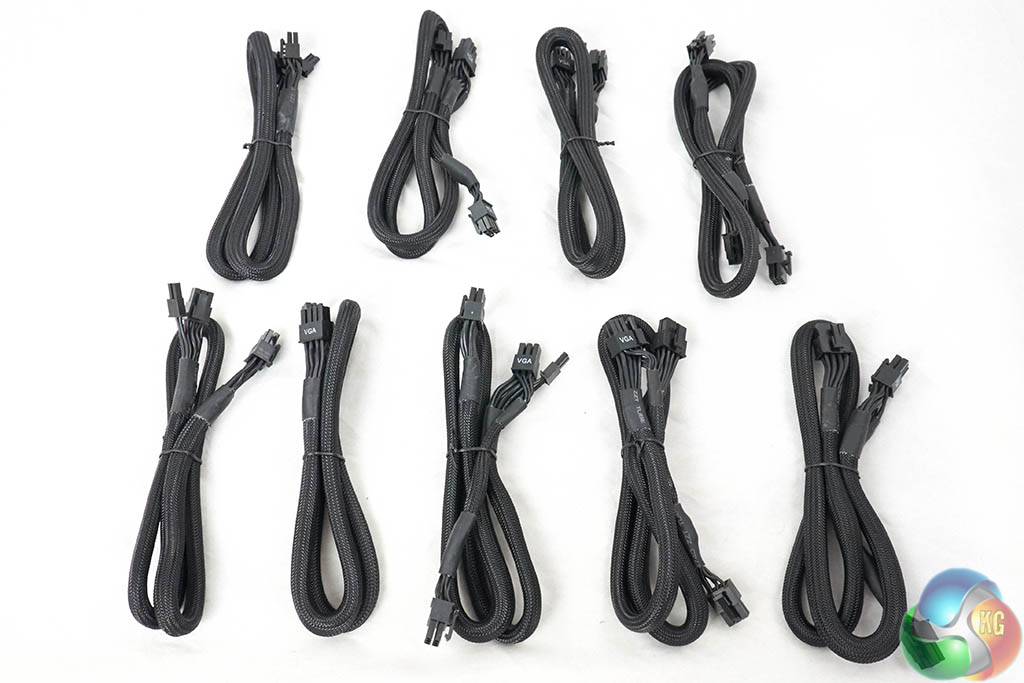 Would you like a cable with that sir? The image above right shows all the PCIe power cables for powering some seriously hardcore multi GPU configurations. The main power cables are all sleeved. Peripheral power cables are the thinner ‘ribbon' style to help with routing. These are quality 18 AWG grade.