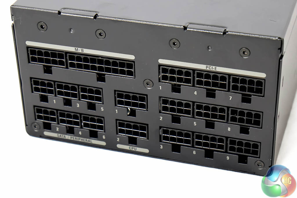 The modular bay is literally crammed with connectors. All of these are clearly sized and labelled to help during the installation phase. On the 1600 watt version of this power supply there is an ‘AUTO/ECO' button bottom left. This is replaced on the 2000 watt model with another SATA/Peripheral connector.