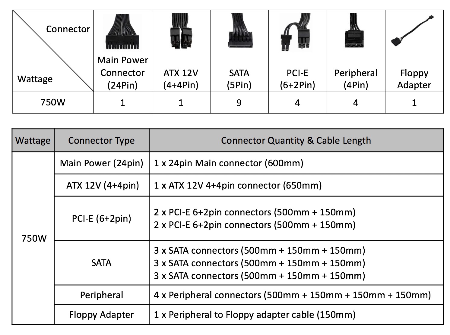 There are four PCI e cables included in the box, to suit systems with dual graphics card configurations. This particular power supply ships with a single ATX 12V 4+4 pin connector.