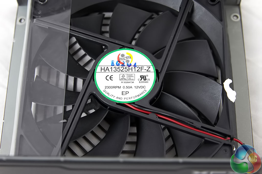 The 135mm cooling fan is supplied by Ong Hua, model number HA13525H12F-Z. This fan is rated 0.5A, 12V, 2,300 rpm max). As we already know it can be toggled into operating in a semi passive mode.
