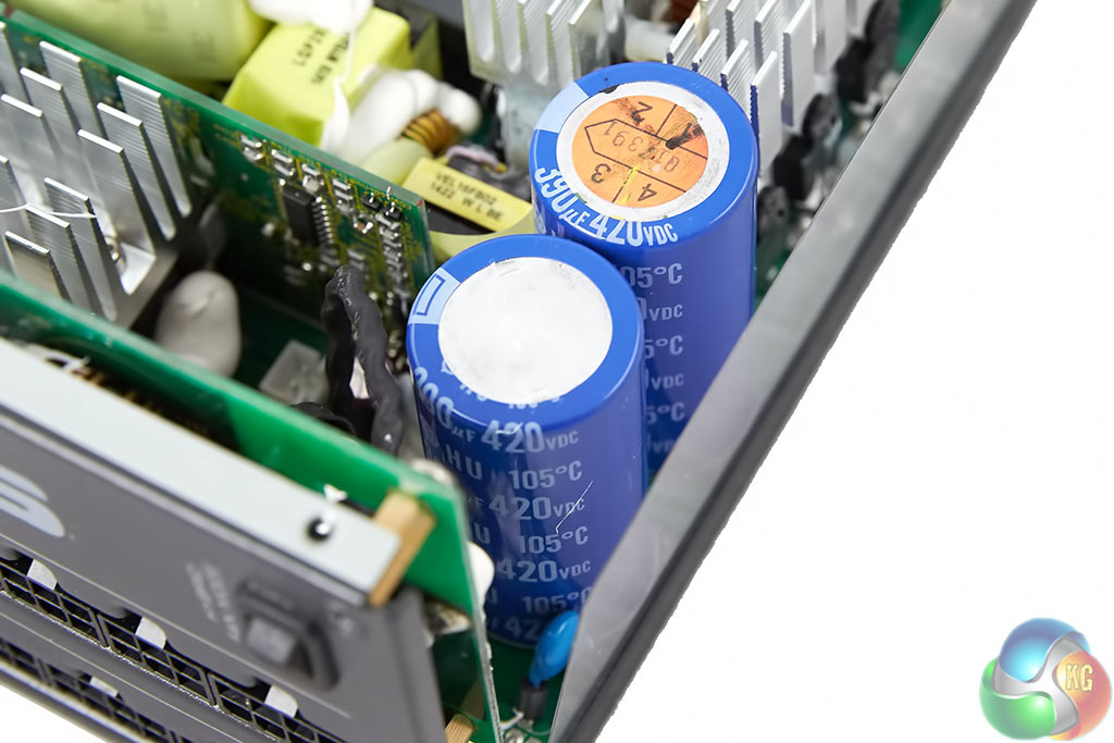 We are pleased to see that the XFX XTS 1000W unit adopts two high grade 105c Japanese capacitors by Hitachi. They are rated 420V, 380 uf each (780uF combined). The Seasonic version of this power supply used Nippon Chemi Con capacitors, but these Hitachi caps are closely matched in quality.