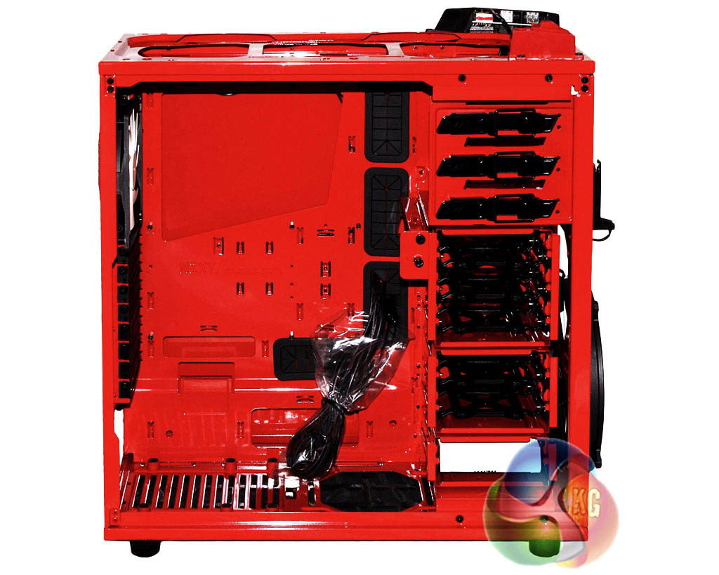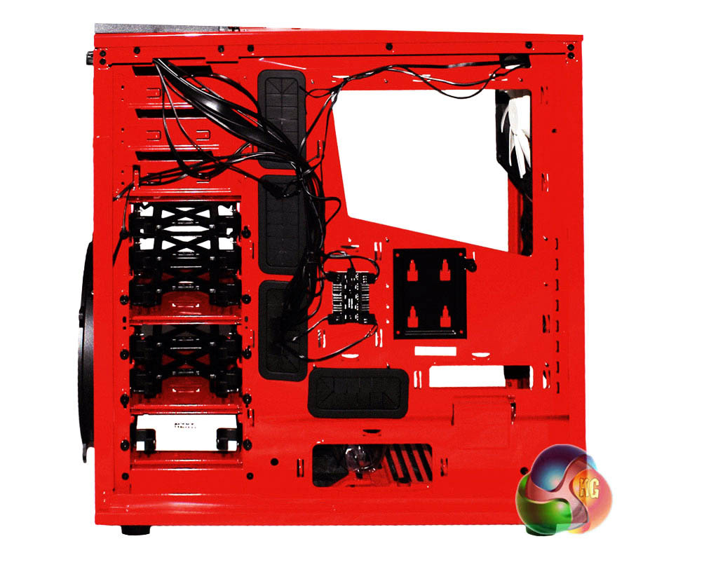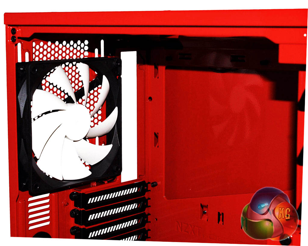 The insides of the case are all red, with black covers and mounts adding to the aesthetic appeal. At the rear is another white fan with a black shroud. There is a 140mm fan installed, exhausting warm air outside the chassis. The mount can also take a 120mm fan.