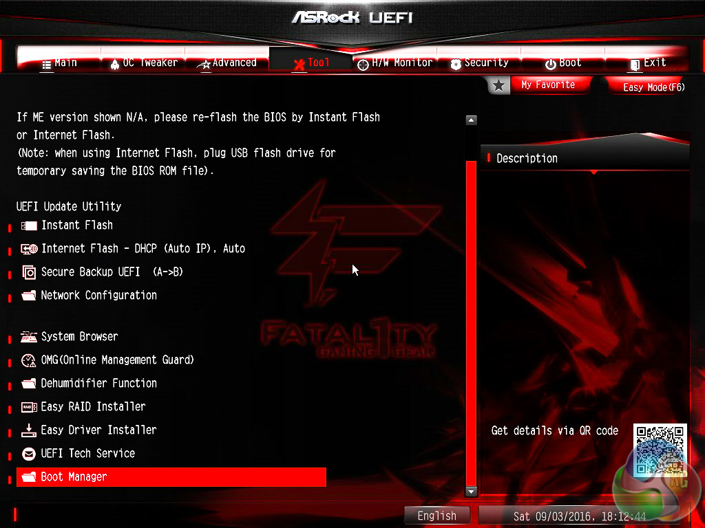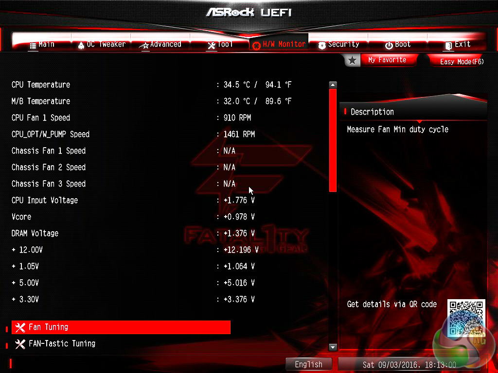 The H/W monitor tab contains the ASRock fan tuning utility. From here you can set standard PWM fan profiles or explore the fan voltage-RPM range with the tuning utility and set your own custom fan curve. The changes to the fan profiles also take place “live” rather than on reboot or save and exit, so it's easy to get the fans set up correctly before leaving the UEFI environment.