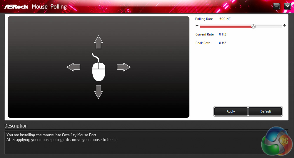 When a mouse is plugged into the Fatal1ty mouse port its polling rate can be manually adjusted up to 1000Hz. In many cases gaming mice have their own software for polling rate adjustments but where they do not this offers a functional solution.