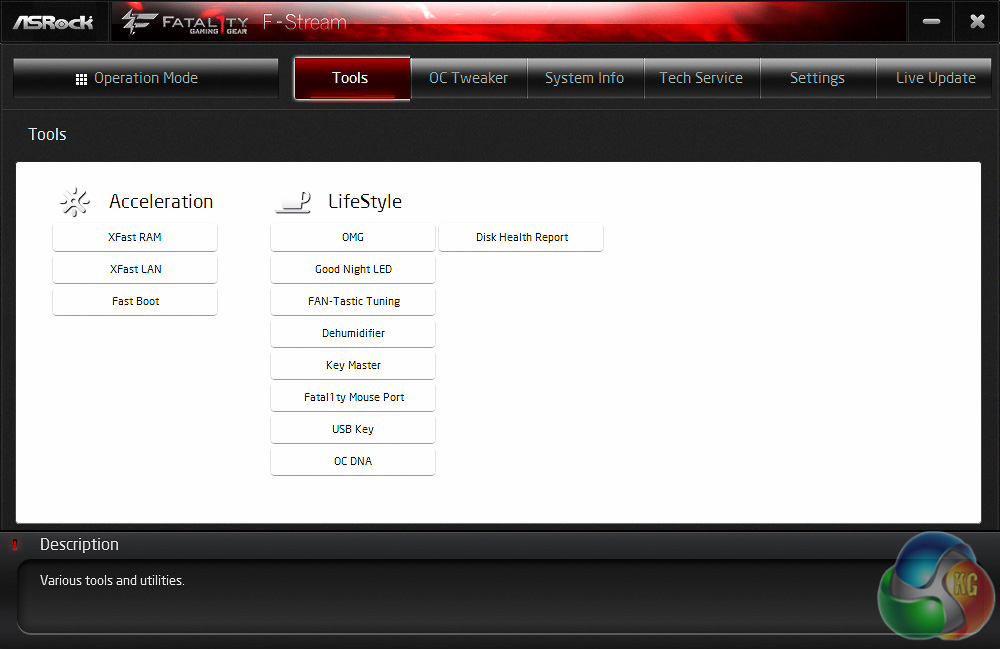 The Tools page within F-Stream lists all the available ASRock utilities for the motherboard in question. The interface is somewhat basic, but gets the job done.