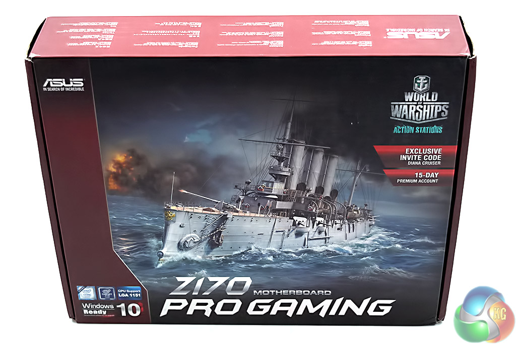 The packaging of the ASUS Z170 Pro Gaming motherboard clearly reiterates the gaming theme with a large image about World of Warships. With eligible purchases ASUS offers a 15 day code for a premium World of Warships account and some other exclusive content packs.