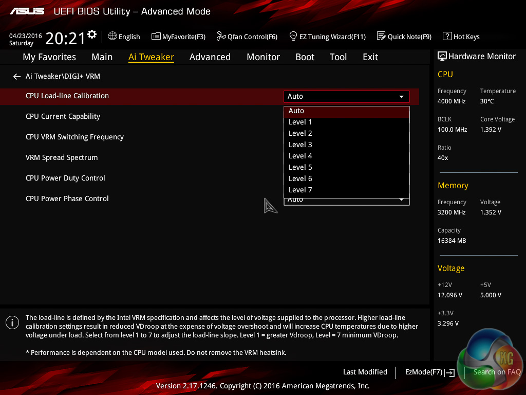 The most common CPU and memory options such as voltages, frequencies and the like, are found under the AI Tweaker tab. Keen overclockers will be pleased to know that there are seven different levels of load line calibration to choose from with Level 1 being the least aggressive and Level 7 the most.