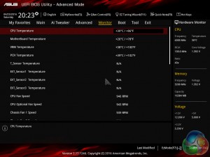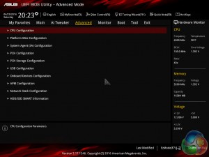 Pressing F7 takes the user into the advanced section which is the full unrestricted ASUS UEFI. Seasoned overclockers and tweakers will feel much more at home here with a full array of CPU, memory and general motherboard tweaking options.