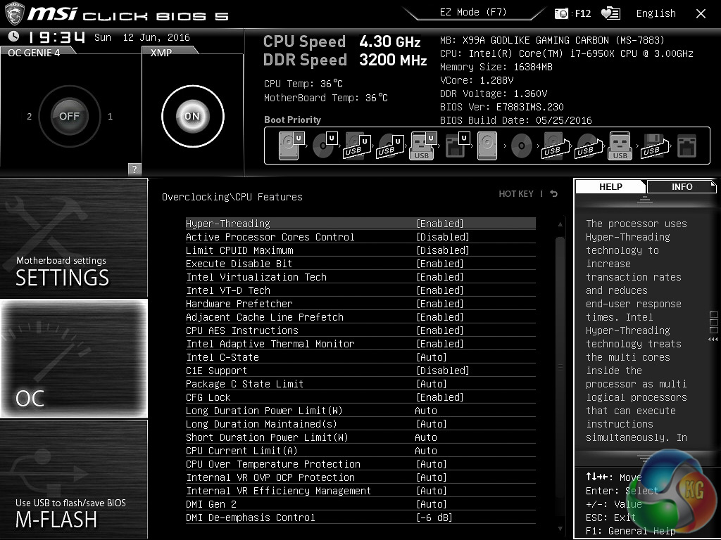 MSI's UEFI is often overlooked, particularly in the HEDT segment, but it is very competent for overclocking prowess. Under the advanced section you'll find a long list of CPU features that can be tweaked, as well as an endless list of voltages.