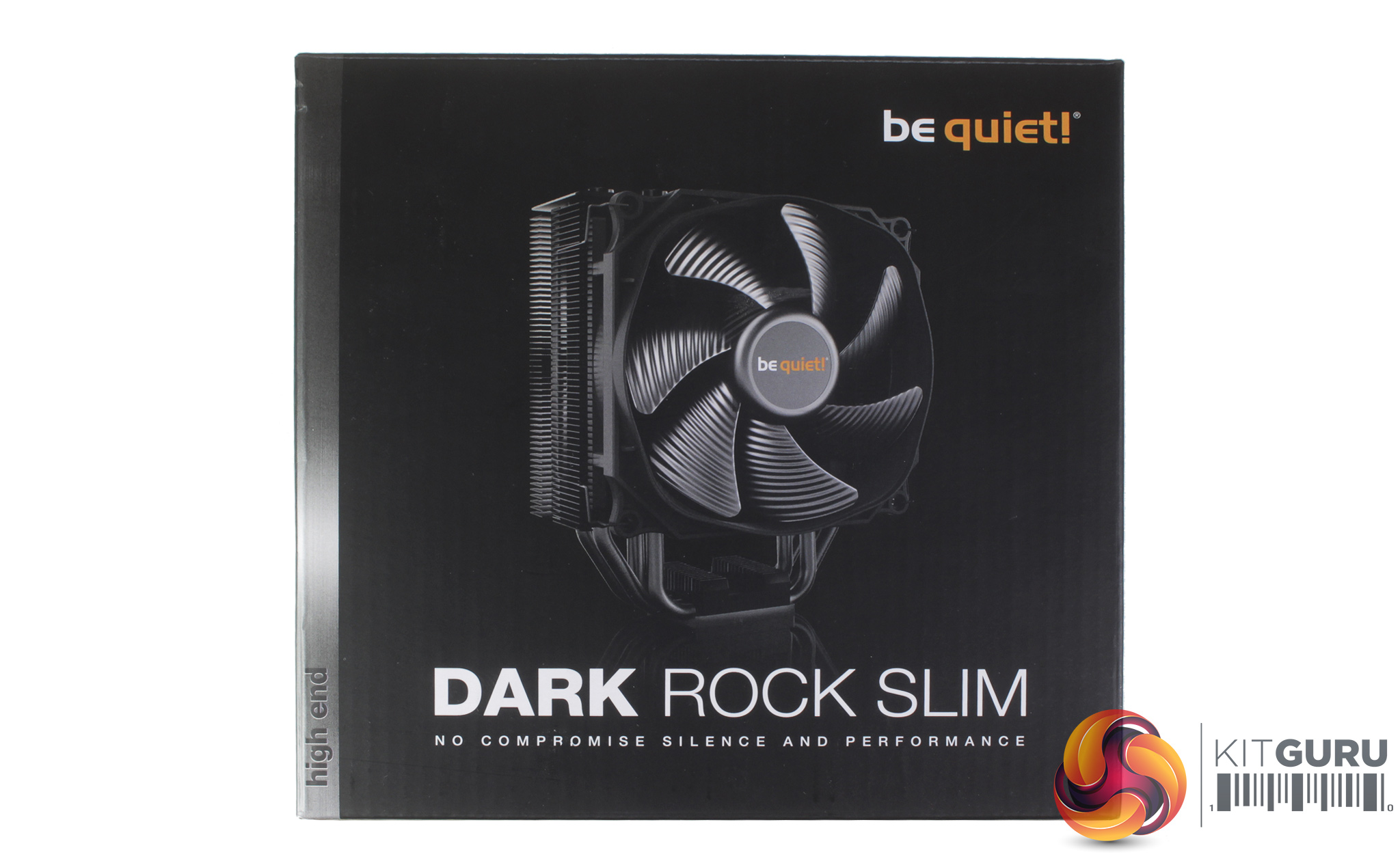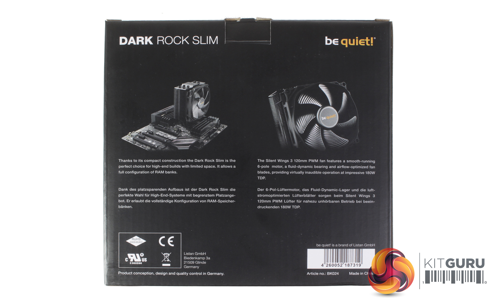 Taking a look at the cooler's box, it uses the exact same aesthetic as other be quiet! coolers from the Dark Rock lineup, and the front of the packaging shows off a large picture of the new Slim cooler. The rear of the box provides a little more detail, along with some core cooler features like the included Silent Wings 3 120mm fan.