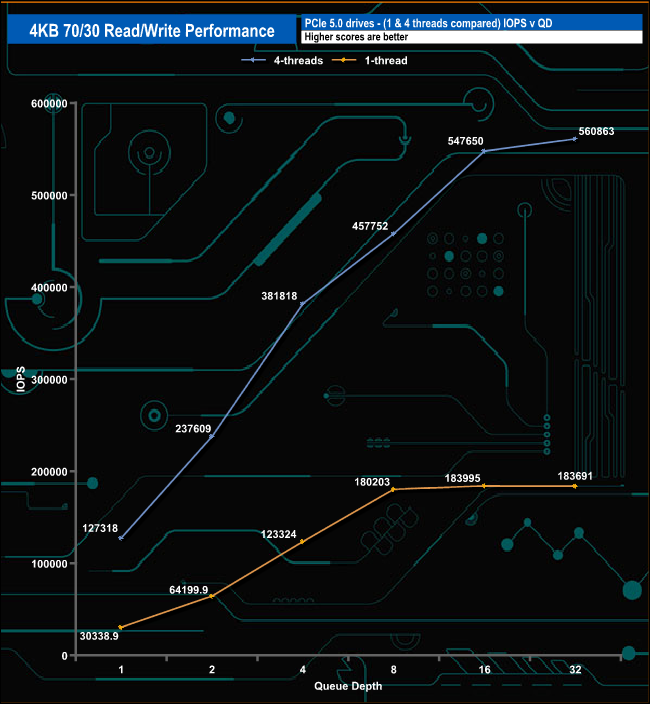 We used CrystalDiskMark 8’s custom settings to test the 4K 70/30 mixed read/write performance of the drive through a range of queue depths using a single thread and four threads.
