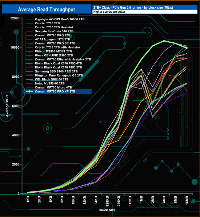 Its test result of 11,561MB/s may be a distance from the official maximum, but the 2TB Corsair MP700 Pro XT is the fastest member of the MP700 family we've seen, and sits just within the top ten drives on this list.