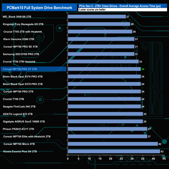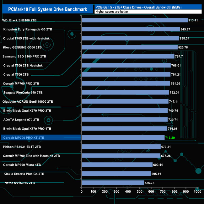 With an overall bandwidth figure of 713.29MB/s, the 2TB MP700 Pro XT sits in the lower half of the results chart.