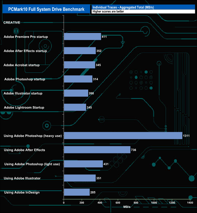 Using PCMark10's Full System Drive Benchmark, the six Adobe startup traces produced an average of 322MB/s, with the fastest being the Adobe Premiere Pro startup trace at 411MB/s, with the Lightroom trace the slowest at 245MB/s. For the five usage traces, the drive averaged 622.8MB/s. The fastest test was, as usual, the Photoshop heavy usage trace at 1,311MB/s, the slowest, the InDesign test at 285MB/s.
