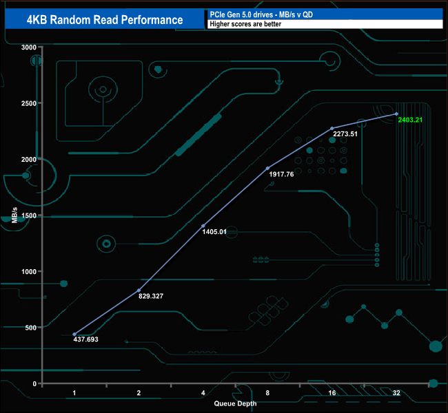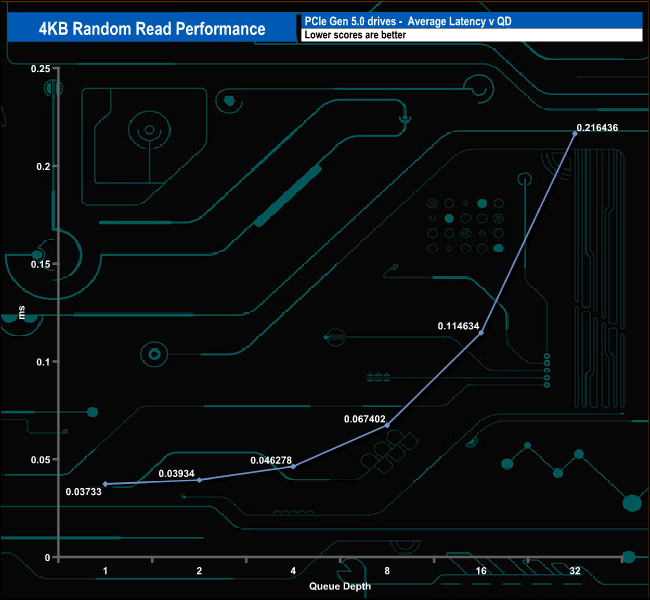 We used CrystalDiskMark 8‘s custom settings to test the 4K random read performance of the drive through a range of queue depths. The setup for the tests is listed below.
